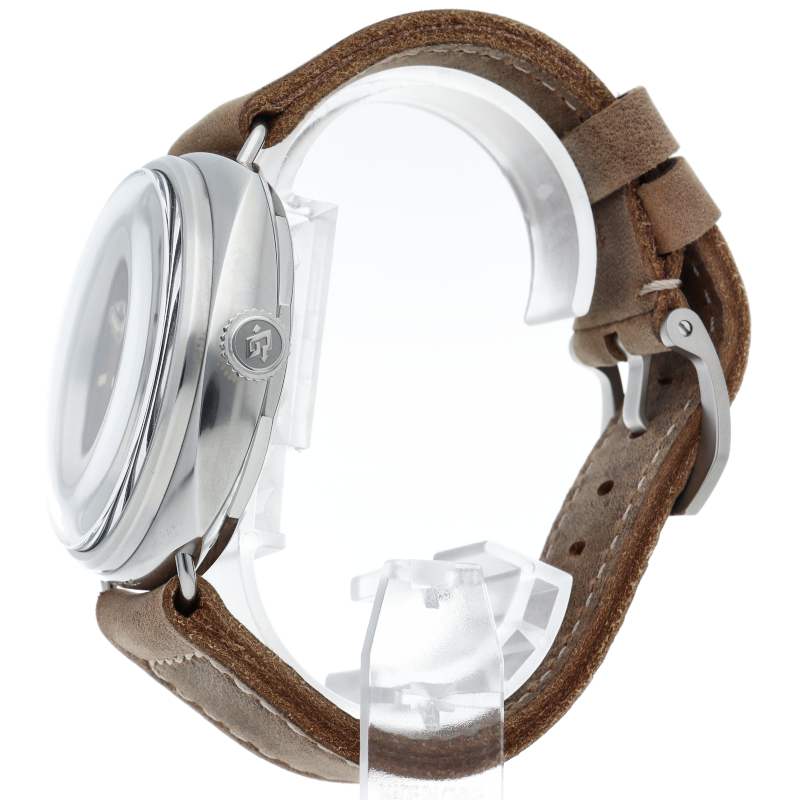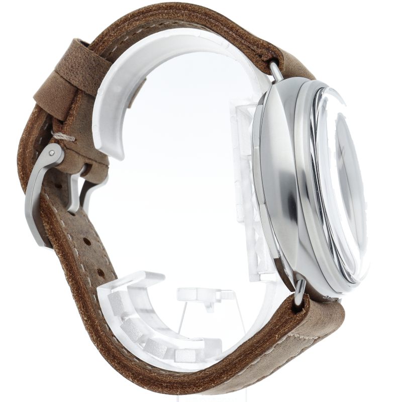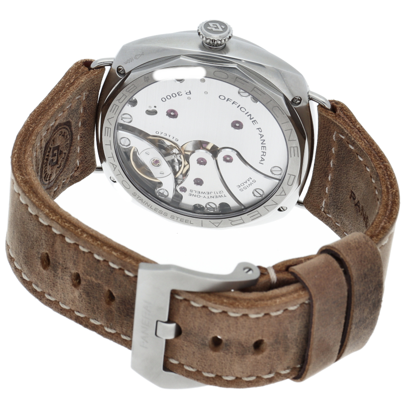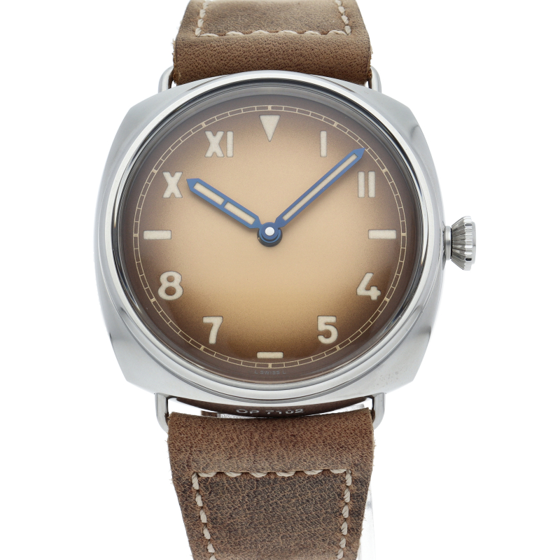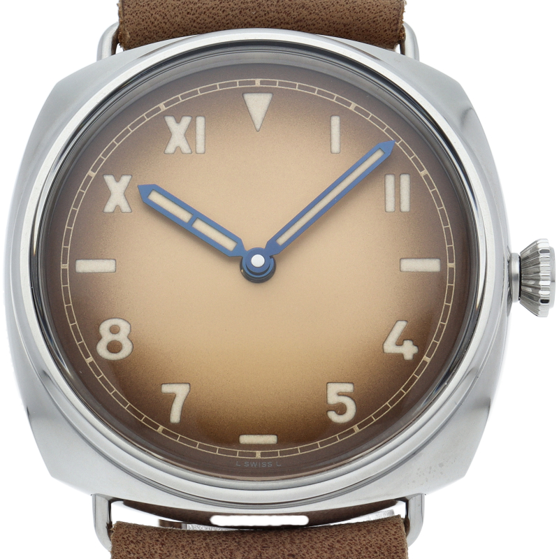 第二次世界大戦中にイタリアの海軍が使用していた時計の復刻モデル「PAM00931」ラジオミール カリフォルニア。軍用機密の観点から文字盤にブランド名などの印字がされていなかったり、時計の向きや時間を読み間違えない為のローマ数字とアラビア数字を組み合わせた文字盤など、随所にオリジナルのディティールを再現しております。