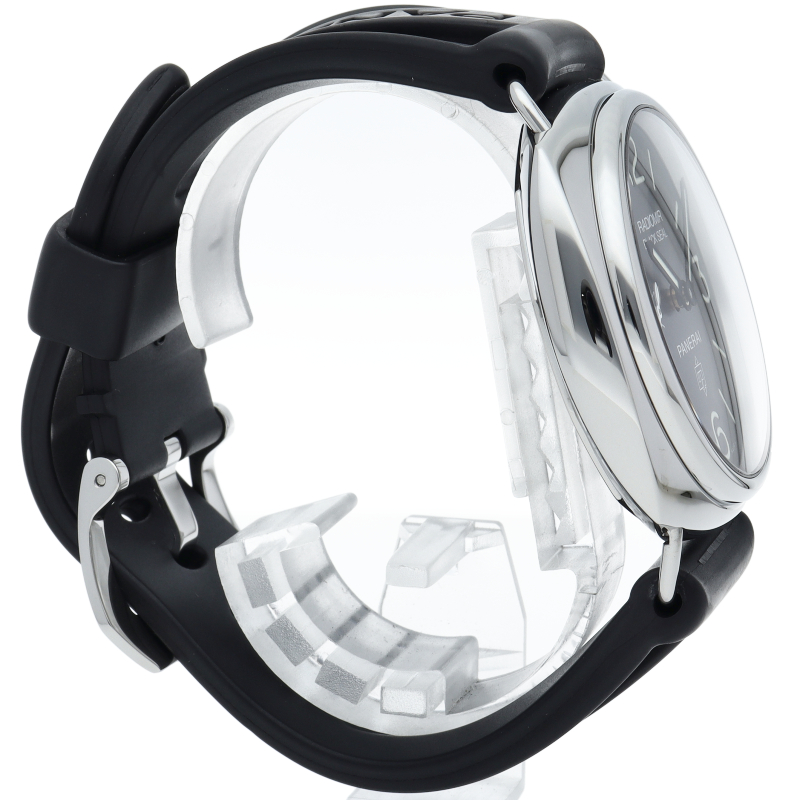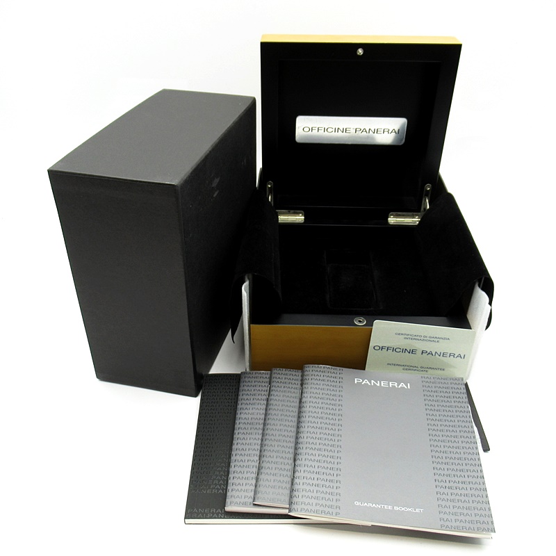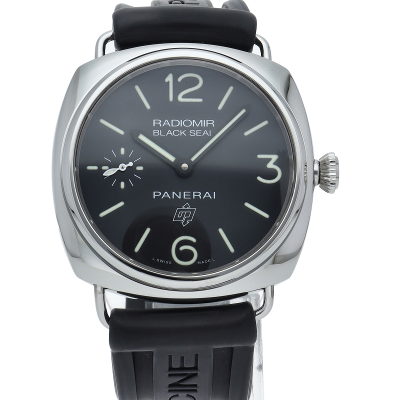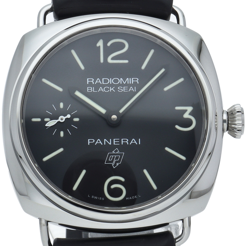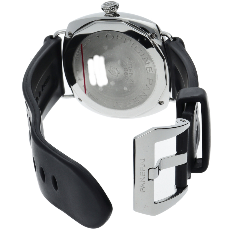 C.O.S.Cクロノメーターの手巻き式ムーブメント、「キャリバー パネライ OPXI」を搭載。「BLACK SEAL」のロゴと「OP」のロゴが入った2011年の「ラジオミール」モデルです。パネライとしては薄型の作りのためスーツスタイルにも合せやすい一本。OP6826。