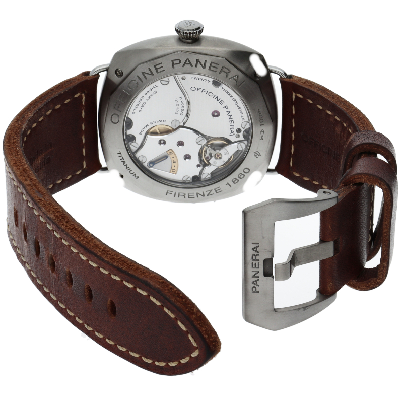 「ラジオミール エイトデイズ チタニオ-45mm」は、ワイヤーループと円錐形のリュウズを備えたサテンチタンのクッションケース。3時位置に配されたデイト表示は、サファイアクリスタルに埋め込まれた小型円形レンズによって確認も容易。無駄がなくミニマルなダイアルは視認性に優れています。Cal.2002によって8日間のパワーリザーブを実現しており、ケース裏のパワーインジケーターで残量を確かめることが可能です。OP7011。