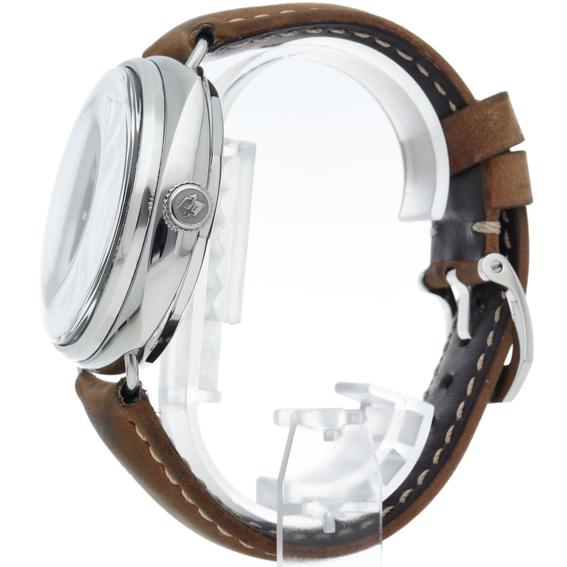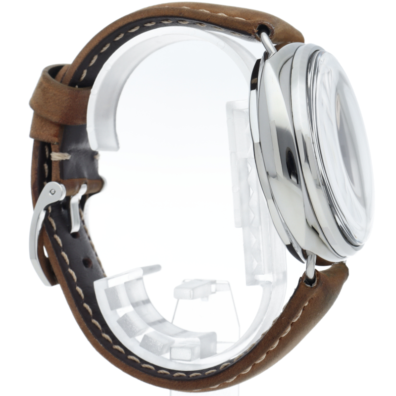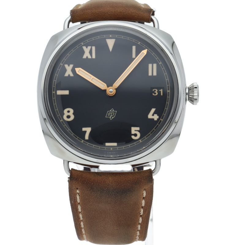 1930年代にパネライがイタリア海軍からの要請で作成したモデルにインスピレーションを受けて誕生した2012年の新作モデルの「ラジオミール カリフォルニア 3デイズ」。インデックスの上半分はローマ数字、下半分はアラビア数字が配され、文字盤にはインデックス以外にOPロゴしかないため、スッキリした印象を受けます。ツインバレルで3日間のパワーリザーブに対応の自社製造手巻きムーブメント搭載。OP6837。