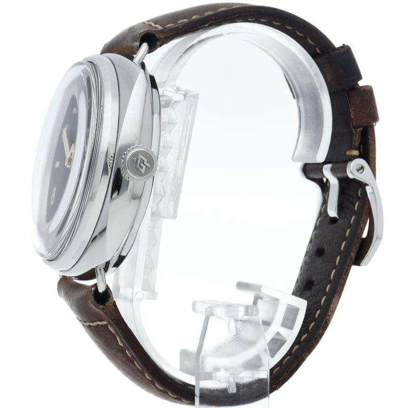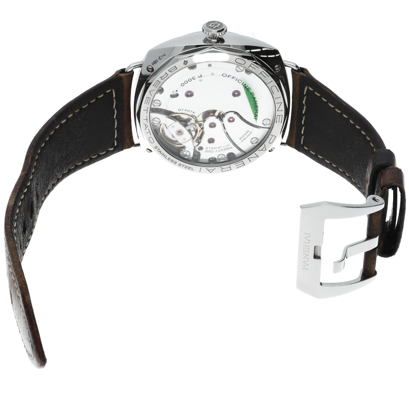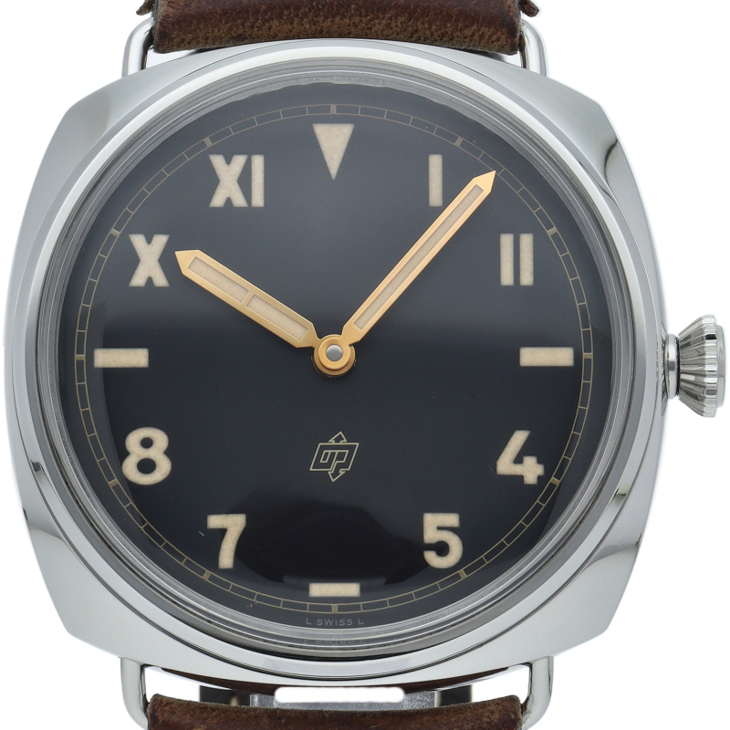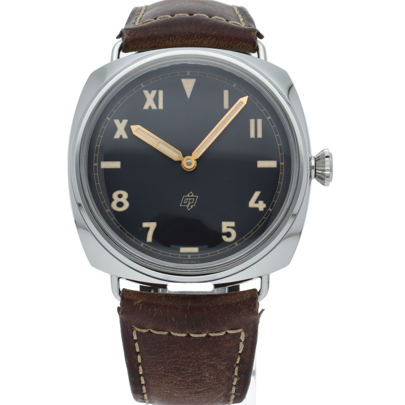 1930年代にパネライがイタリア海軍からの要請で作成したモデルにインスピレーションを受けて誕生した2012年の新作モデルの「ラジオミール カリフォルニア 3デイズ」。インデックスの上半分はローマ数字、下半分はアラビア数字が配され、文字盤にはインデックス以外にOPロゴしかないため、スッキリした印象を受けます。ツインバレルで3日間のパワーリザーブに対応の自社製造手巻きムーブメント搭載。OP7068。