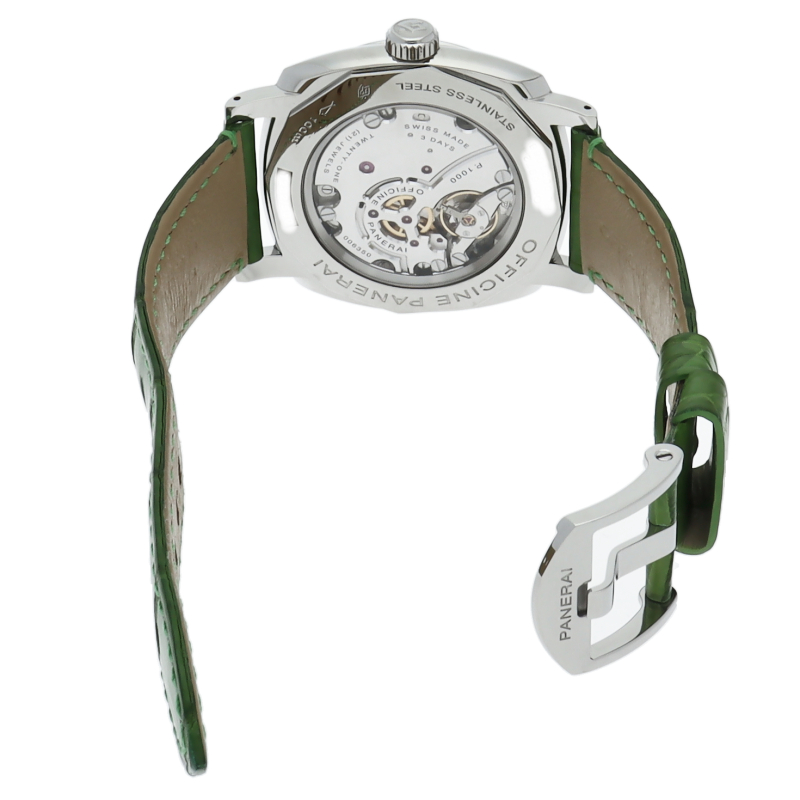 自社製手巻きムーブメントP.1000を搭載し、ツインバレルにより3日間(72時間)のパワーリザーブに対応した「PAM00574」。9時位置にスモールセコンド配置し、ダイアルは視認性を高めるために設計された「サンドイッチダイアル」と呼ばれる2層構造になっています。OP6972。
