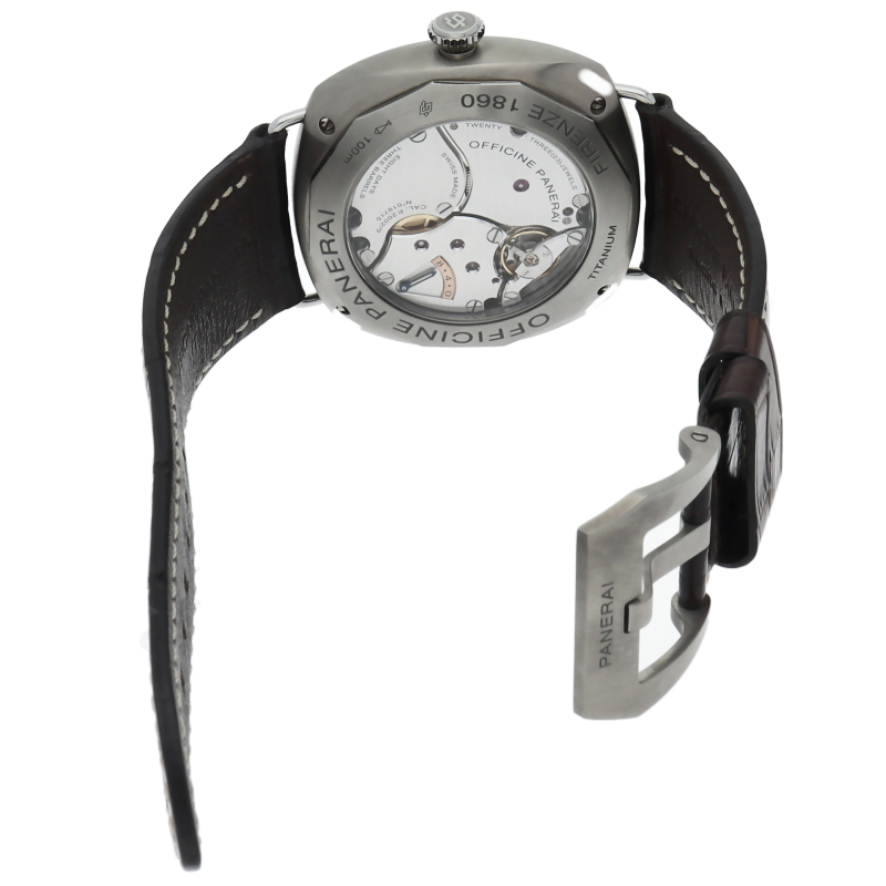 ジャガールクルト製ムーブをベースとするCal.OP XIV(8日間パワーリザーブ)を搭載したモデルです。裏スケルトンからは装飾を施した地板や、アンティークな雰囲気のスワンネック緩急針をご覧頂けます。