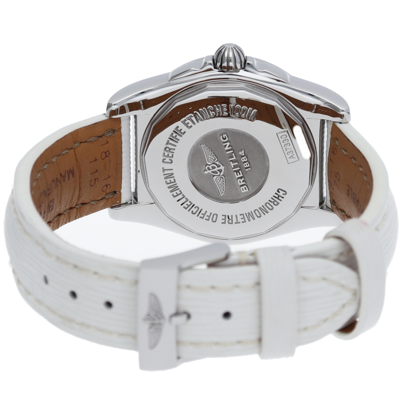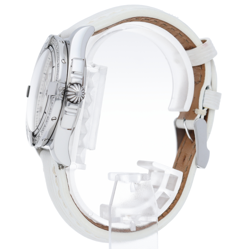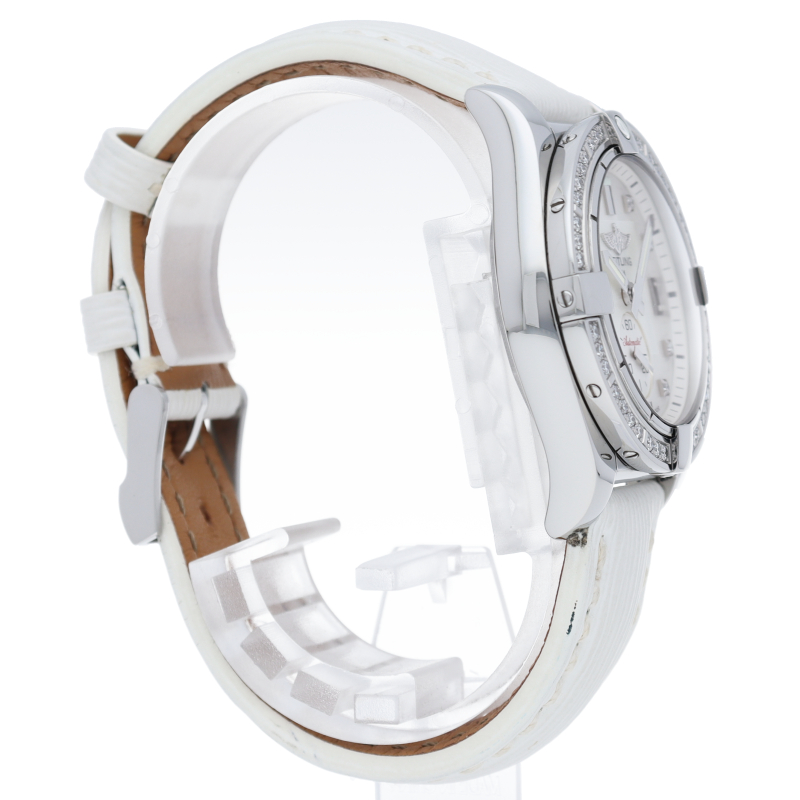 女性らしさを一層引き立てる8Pダイヤインデックスとダイヤベゼルを配し、ホワイトシェル文字盤を採用した華麗な一品です。シェル文字盤に8ポイント、ベゼルにはダイヤモンドを施した豪華なモデルです。