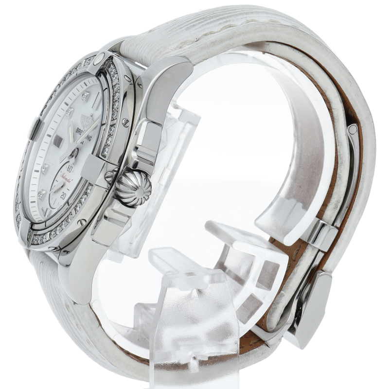女性らしさを一層引き立てる8Pダイヤインデックスとダイヤベゼルを配し、ホワイトシェル文字盤を採用した華麗な一品です。シェル文字盤に8ポイント、ベゼルにはダイヤモンドを施した豪華なモデルです。