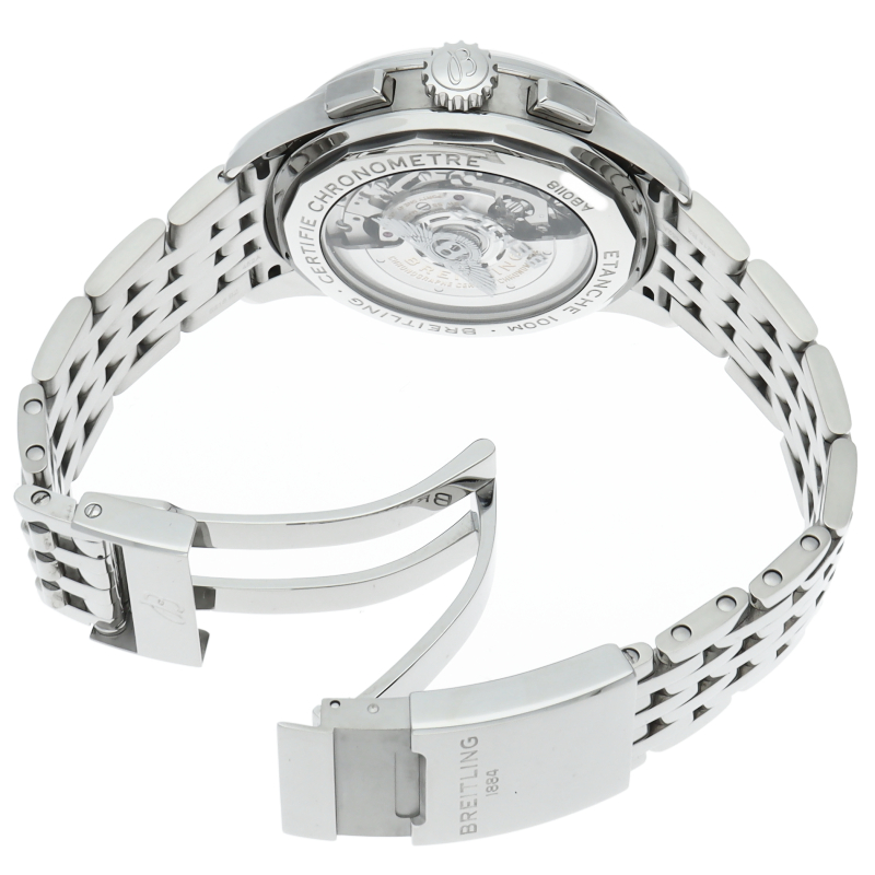 プレミエ B01 クロノグラフ 42 ベントレーブリティッシュ・レーシング・グリーンは、世界有数の高級自動車メーカーであるベントレーモーターズとの長年にわたるパートナーシップを記念したモデルです。ブライトリング自社開発製造キャリバー 01機械式ムーブメントを搭載し、トランスパレント・ケースバックからその動きが見えるこのモデルは70時間の優れたパワーリザーブを持ちます。