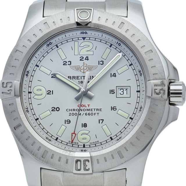 海をテーマにしたエアロマリン「コルト」です。ライダータブが付いた逆回転防止ベゼルはグローブを着けたままでも操作性が高く、防水性能も日常生活防水以上の200mが確保されています。ブライトリング74搭載。