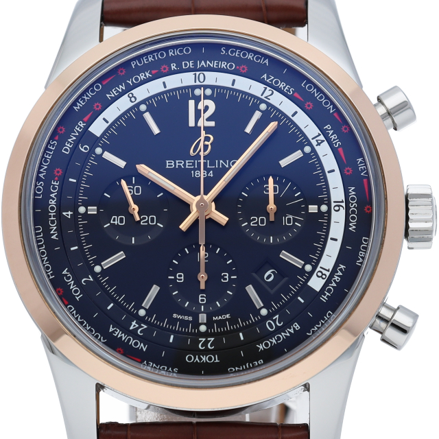 1958年に誕生した初代トランスオーシャンクロノをオマージュしたデザインは、機械式時計の黄金時代である、1950~60年代のクラシカルなクロノグラフの美しさを再現しています。こちらはクロノグラフ機能の他に、文字盤外周の【都市名リング】と内側の【24時間リング】をセッティングすると、世界主要24都市の時間帯を同一文字盤上で常時確認可能な「ユニタイム機能」が搭載されています。UB0510(UB0510U4/BC26)