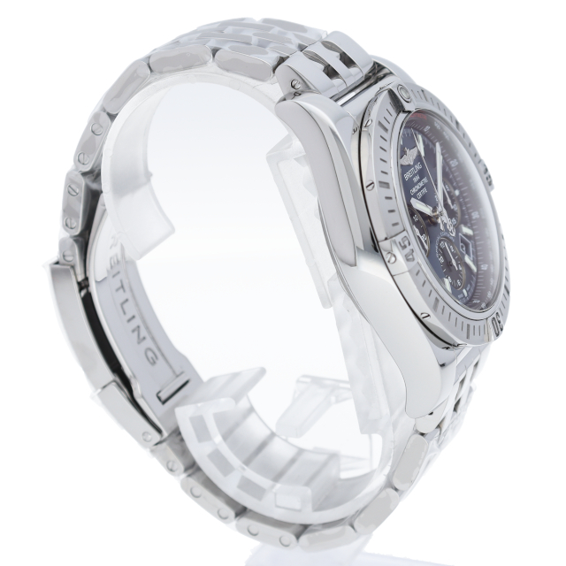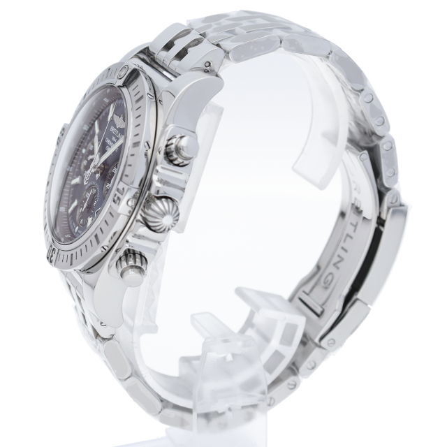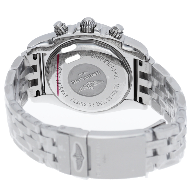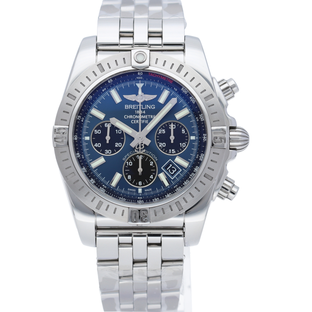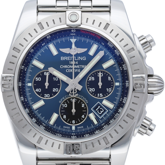 ブライトリング初の完全自社開発・自社製造のクロノグラフキャリバーB01を搭載。従来のキャリバーよりもスリムな設計のため、それを内蔵するケースもわずかに薄型化されています。ただしケースバックの造りなどは、さらに堅牢なものに改良されており、従来の防水性能を300mから500mへまでスペックアップさせたのは驚異的な成果と言えるでしょう。こちらは爽やかなブルーダイアルの日本限定です。AB0115(AB011511/C987)
