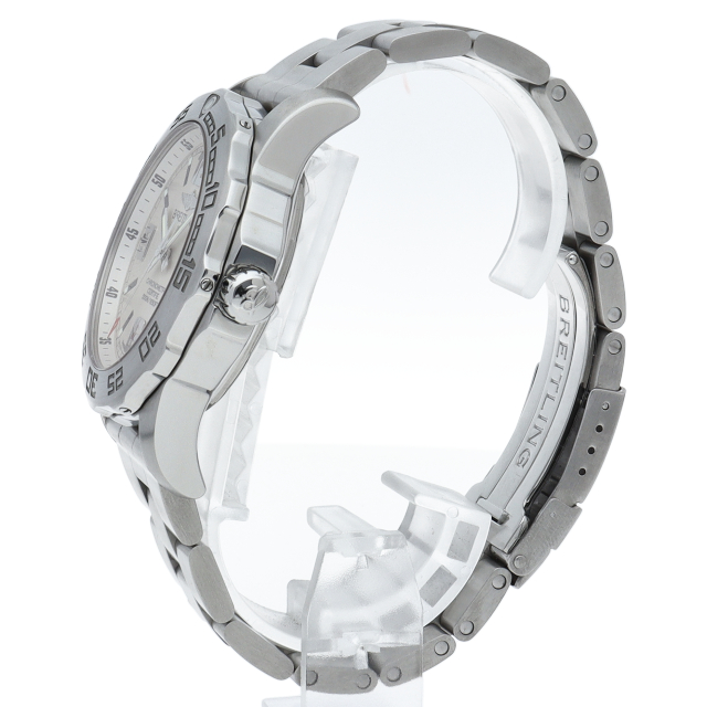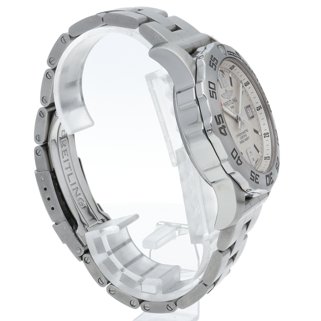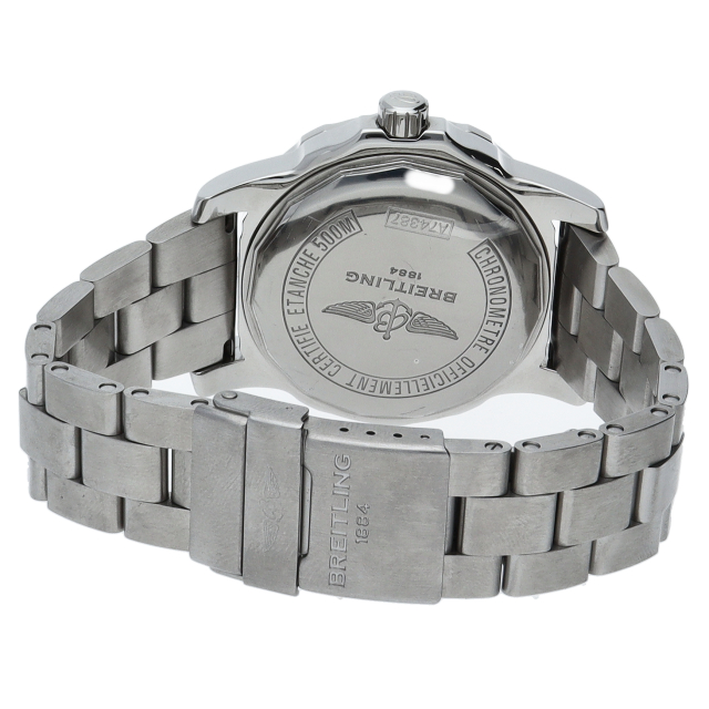 海をテーマにしたエアロマリン「コルト」です。ライダータブが付いた逆回転防止ベゼルはグローブを着けたままでも操作性が高く、防水性能も日常生活防水以上の200mが確保されています。ブライトリング74搭載。A74387(A743G43PCS)。
