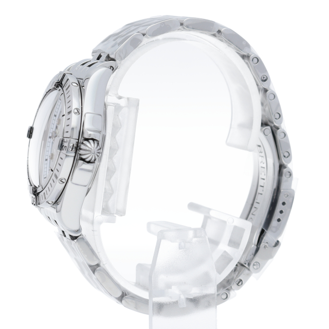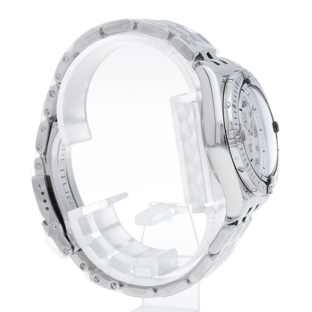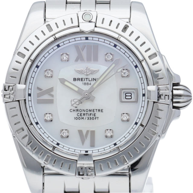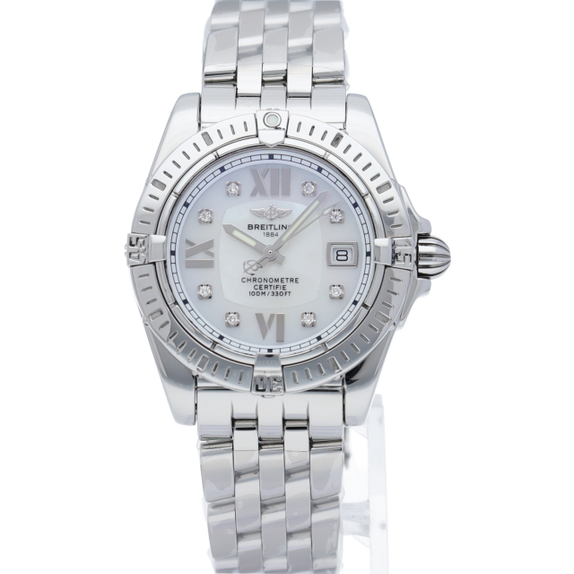 よりシンプルに、直感的に時刻が分かることを追求した「ギャラクティック32」。32はケース径を表しており、2タイプあるレディースモデルでも小振りなケースサイズとなります。ムーブメントには高精度を誇るスーパークォーツのブライトリング71を搭載。ホワイトシェル文字盤には8ポイントのダイヤモンドをセッティングし、華やかで上品な雰囲気を演出します。A71356(A712A63PA)。