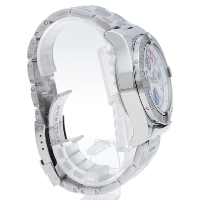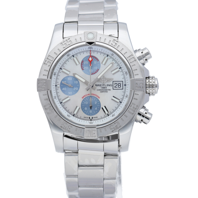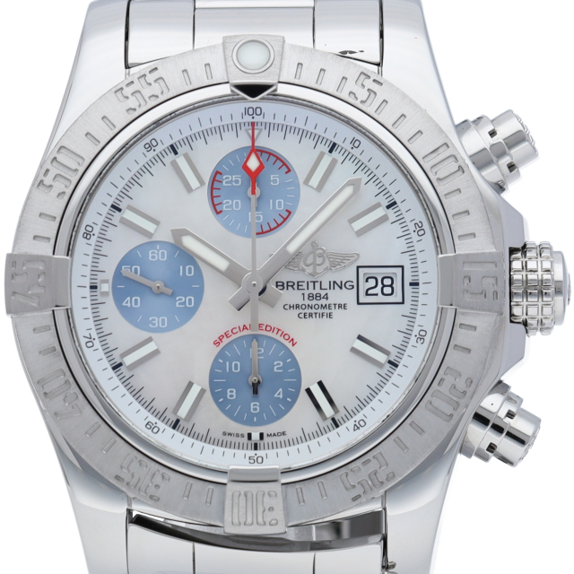 信頼性、操作性、パフォーマンスというブライトリングの特長を体現するアベンジャー・シリーズ。本作では先代アベンジャーIIのラインアップで通常モデルにはなかったマザーオブパール文字盤を採用。インダイヤルにはブルーのマザー オブ パールを配し、青い空と白い雲を表現しています。機能性を損なわず、天然素材ならでは個性と美しさを兼ね備えたクロノグラフです。