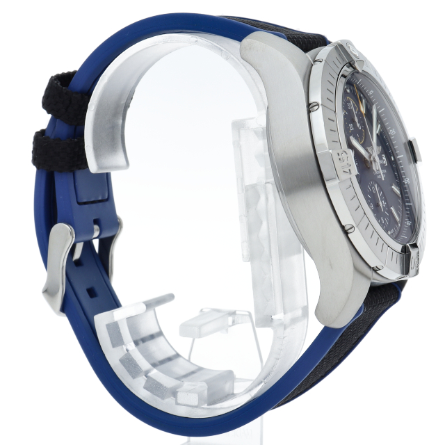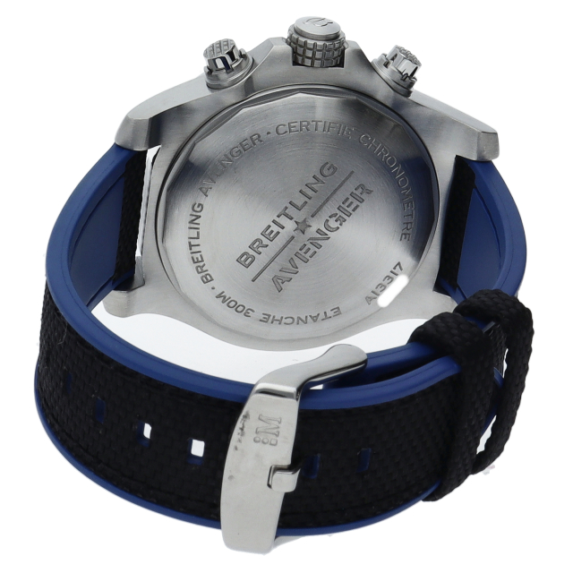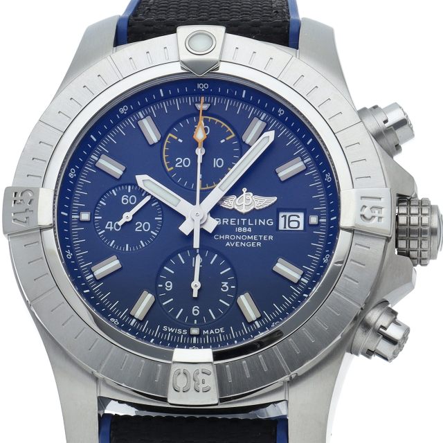 大胆な外観に頑強かつ優れた耐衝撃性を備えたアベンジャー クロノグラフ 45のステンレススチール製ケースは逆回転防止機能付きラチェット式ベゼルを装備、ダイヤルはブラックまたはブルーをご用意しました。ムーブメントは自動巻きのブライトリング キャリバー13を搭載。A13317(A13317101C1X1)