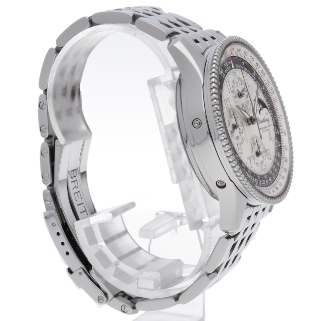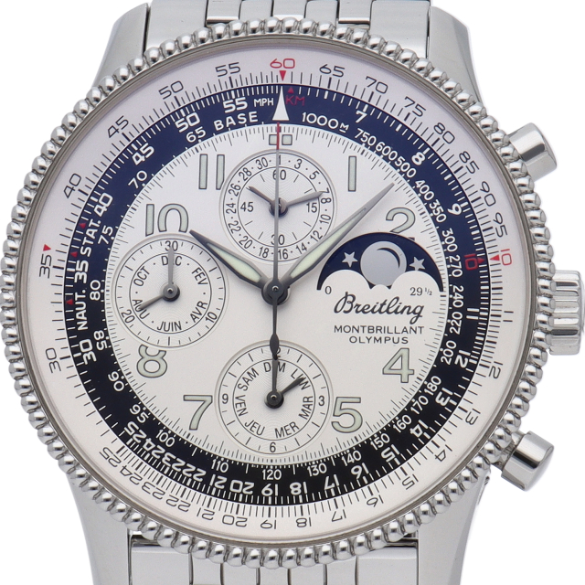 ブライトリングの聖地ともいえるモンブリランの名を冠した、ナビタイマーラインのクラシカルモデル。1940年代のデザインが香り漂うパール装飾の回転ベゼルはナビタイマーと異なり上品な印象を与えてくれる。時刻表示と計算尺目盛りはツートンに彩られ、視認性が高められている。ムーブメントは4年に一度しか調整の必要の無いセミパーペチュアルカレンダーで、月、日、曜日、ムーンフェイズがダイヤル上に表示される。