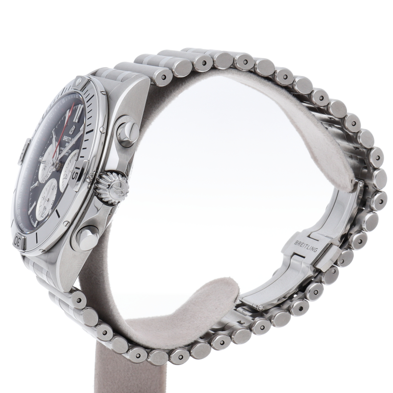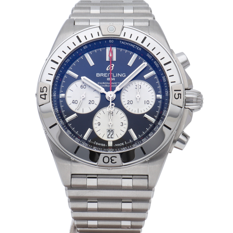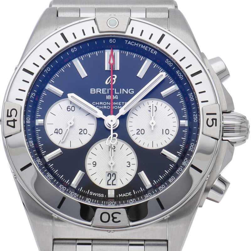 あらゆる要望に応えるブライトリングの万能モデル。クロノマットは、ブランドの歴史の中で重要な位置を占めるモデルです。42mmケースと4カ所にライダータブを配したアイコニックなベゼル。ダイヤルはブラックで、サブダイヤルは対照的なシルバー。バタフライクラスプ式のルーローブレスレットが採用されています。AB0134(AB0134101B1A1)