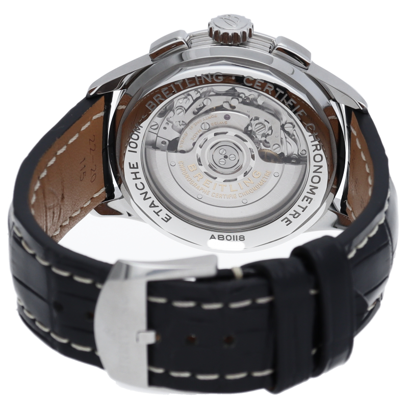 完全自社開発&自社製造クロノグラフムーブメント、「ブライトリング 01」を搭載し、シースルーバック仕様を採用したモデルです。AB0118(AB0118221G1P2)