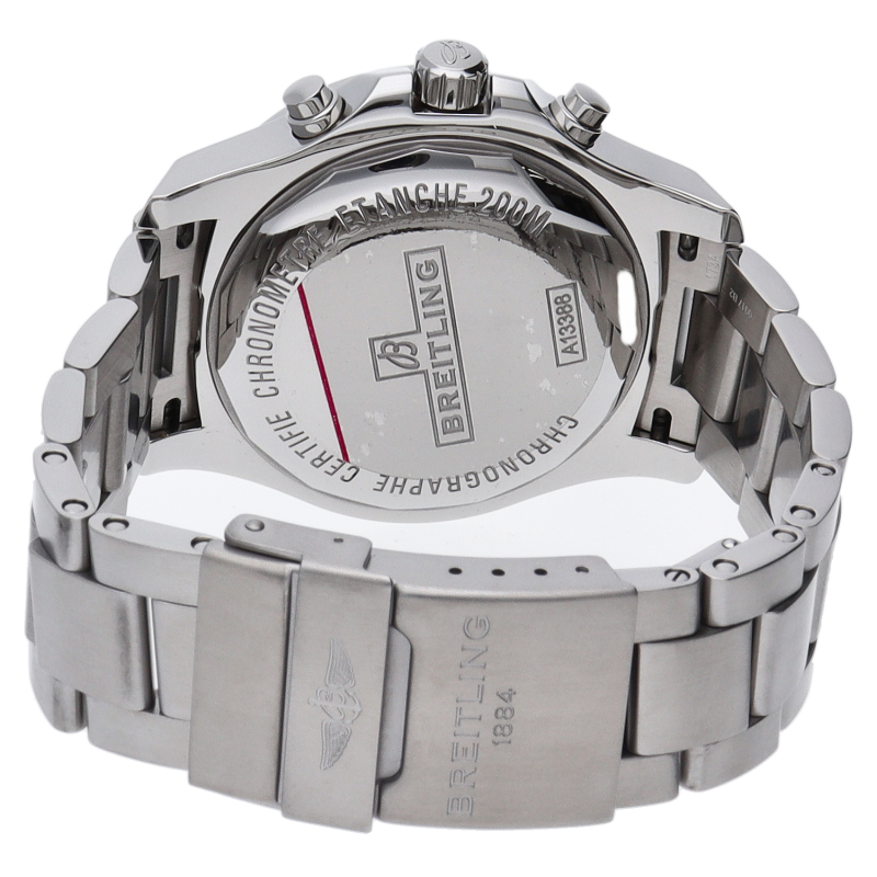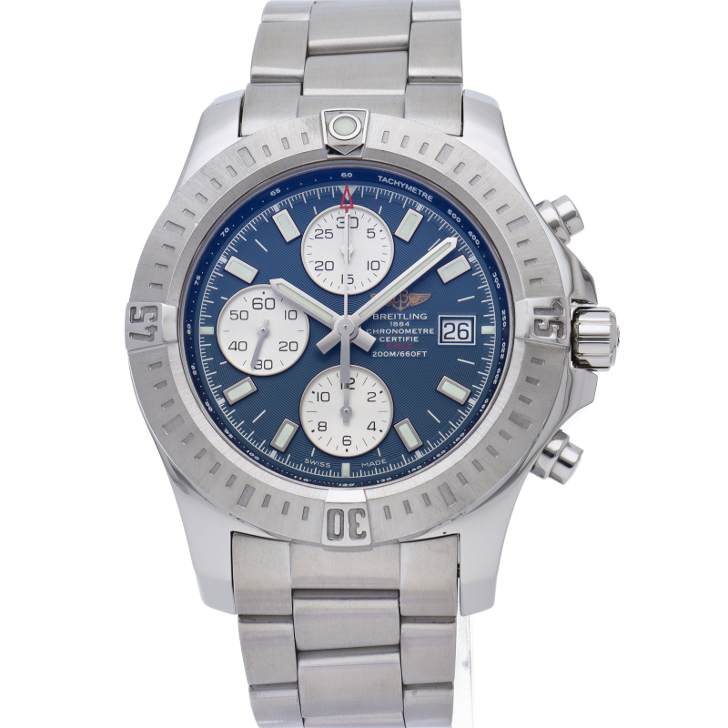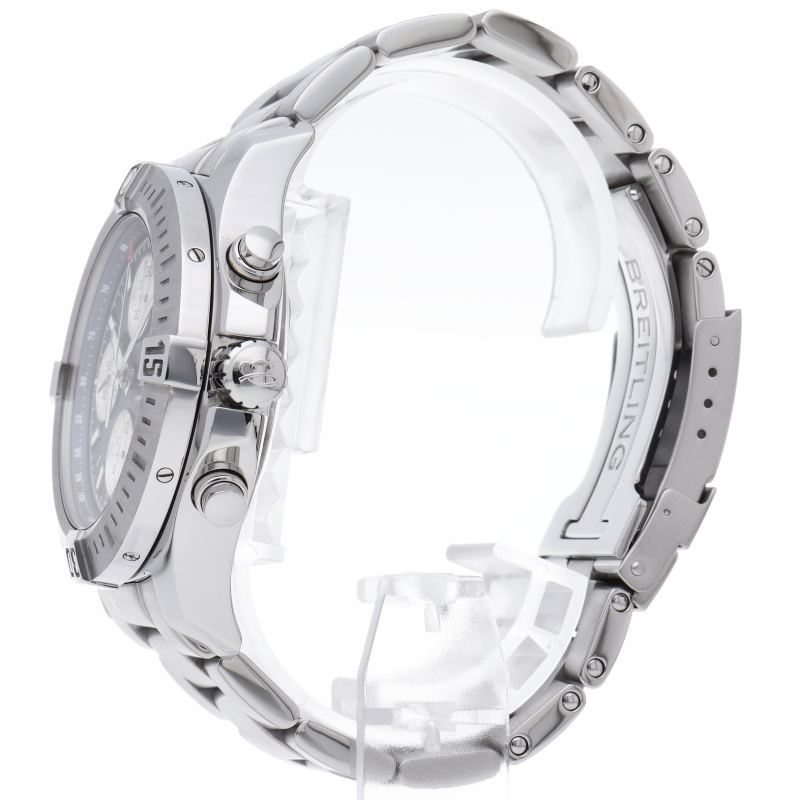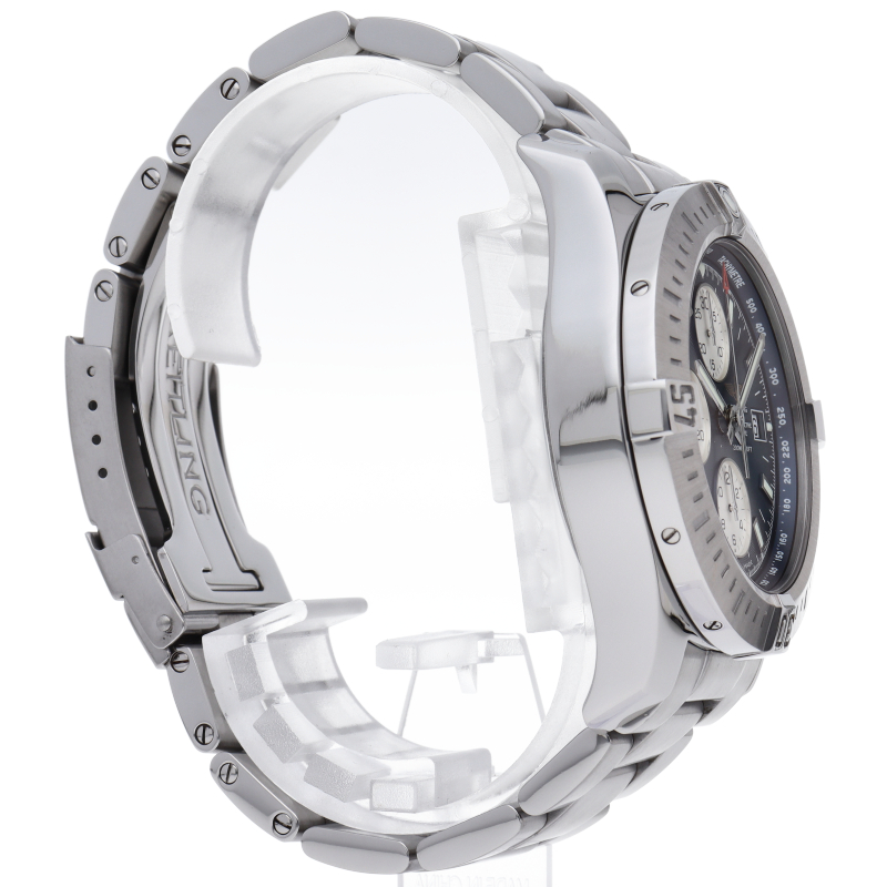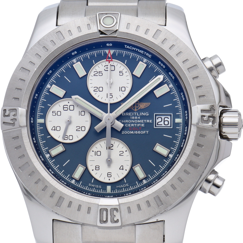 クロノグラフ機構を搭載した人気モデル「コルト クロノグラフ」。幅の広いサテン仕上げのベゼルには、ブライトリングファンにおなじみのライダータブが装備されます。A13388(A1338811/C914)