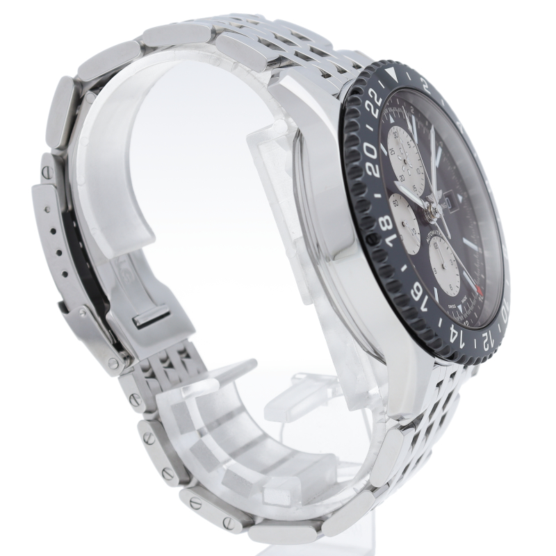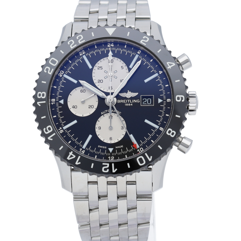 ブライトリングの1960年代の名作「アビエーション」を新しいスタイリングで復刻したモデルです。長距離フライトに対応した24時間表示の第2タイムゾーン表示を備え、回転ベゼルはブライトリング初のファインセラミック製となっています。Y24310/Y2431012/BE10