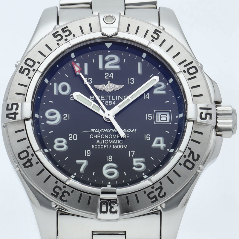 特殊部隊の為に開発されたスーパーオーシャン。ケース内の圧力差が約3気圧を超えると、ケース内に蓄積したヘリウムガスを自動的に放出し、時計が破裂するのを防ぐという画期的な機構を搭載しています。視認性もよく、1500メートルという圧倒的な防水性能は、他のモデルを圧倒します。A17360/A183B39PRS。