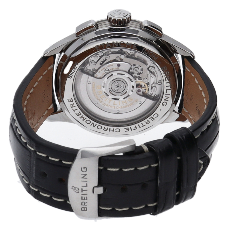 完全自社開発&自社製造クロノグラフムーブメント、「ブライトリング 01」を搭載し、シースルーバック仕様を採用したモデルです。