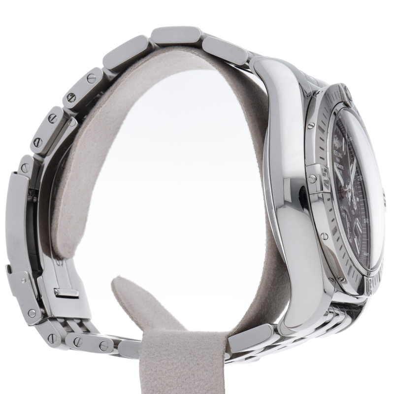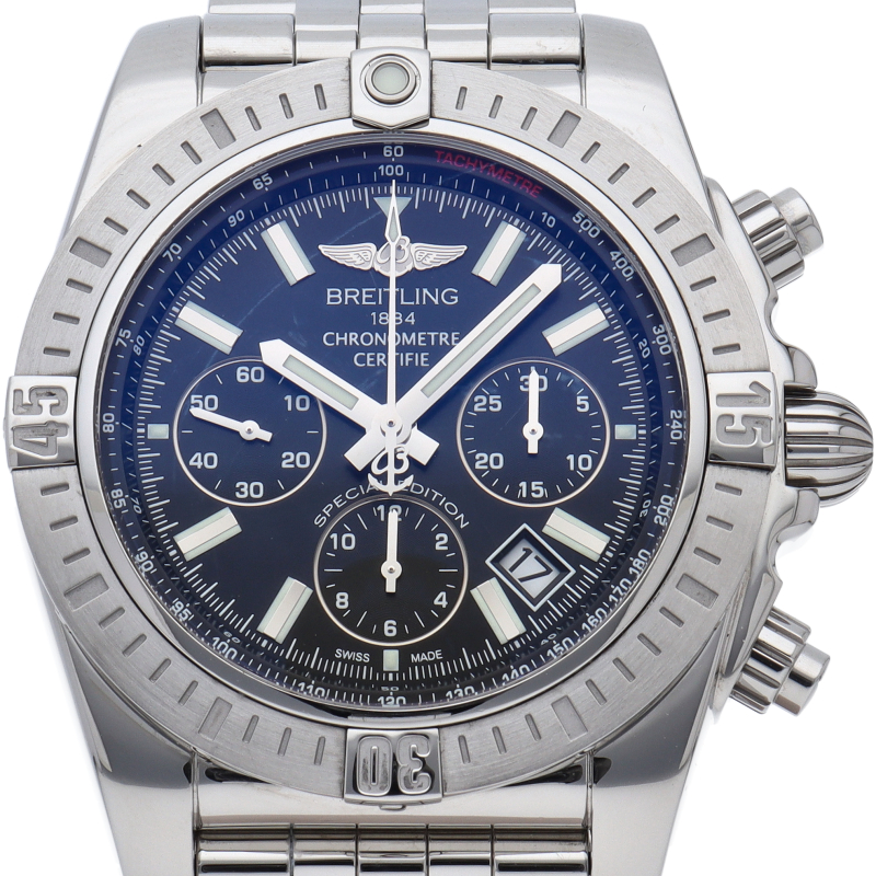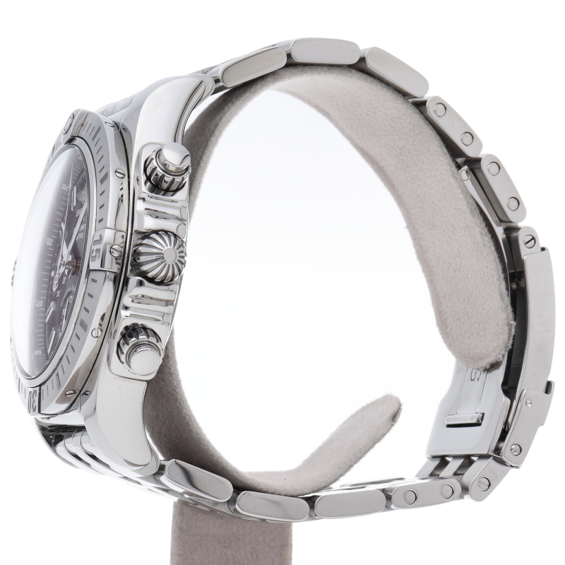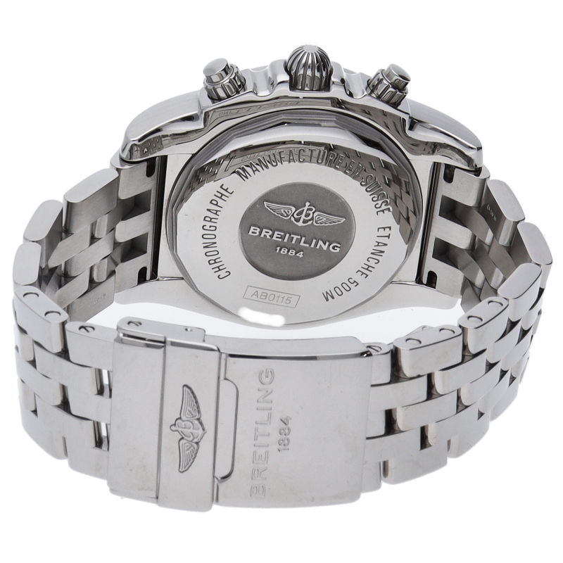 ブライトリング初の完全自社開発・自社製造のクロノグラフキャリバーB01を搭載したモデルです。従来のキャリバーよりもスリムな設計のため、それを内蔵するケースもわずかに薄型化されています。こちらはシックなブラックダイヤルの日本特別モデルです。AB0115/AB0115111B1A1