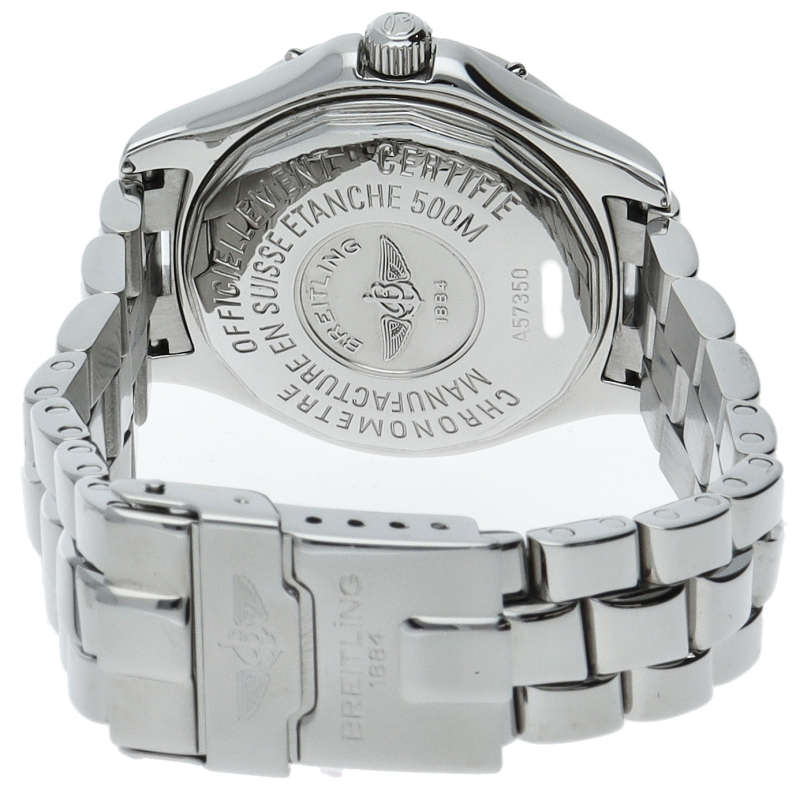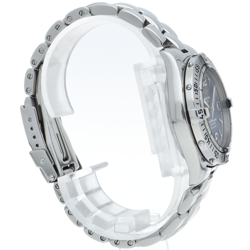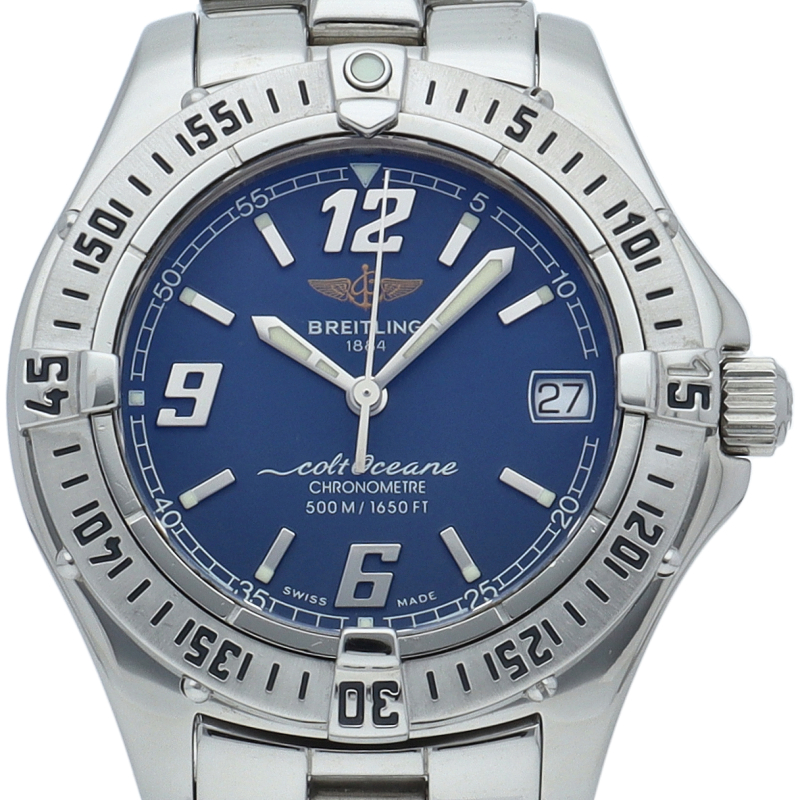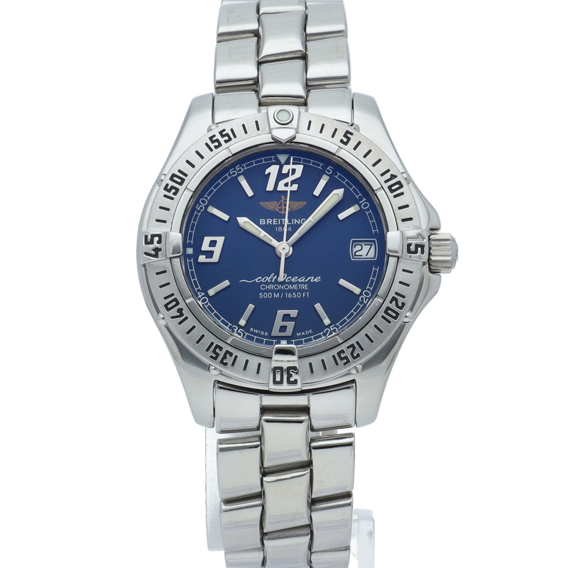 「コルト オーシャン」というモデル名の通り、こちらは500m防水という高機能を搭載したダイバーズウォッチです。ブライトリングを代表する機能であるライダータブ付きの回転ベゼルも装備。A57350。
