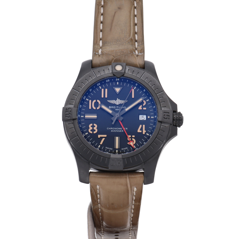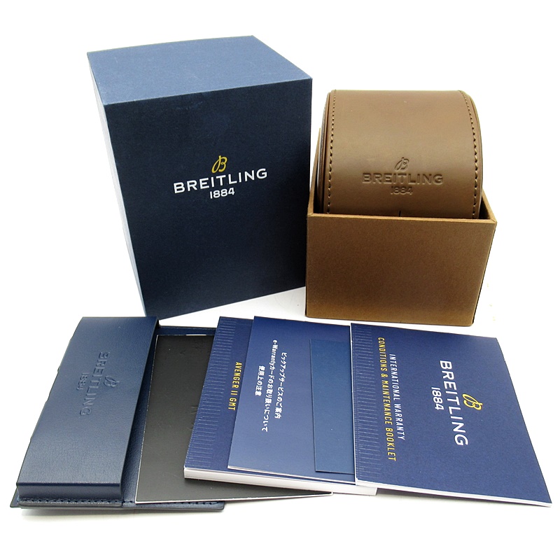 2001年に誕生した「アベンジャー」は、ナビタイマー、アビエイターに並び“空”に関連したコレクション。頑強ながらも軽量なDLCコーティングチタン製ケースとブラックの文字盤は相性もよく、航空母艦の甲板にみられるようなステンシル書体にインスパイアされたアラビア数字もブラックの文字盤によく映えます。ムーブメントはパワーリザーブ約42時間の「ブライトリング32」を搭載。