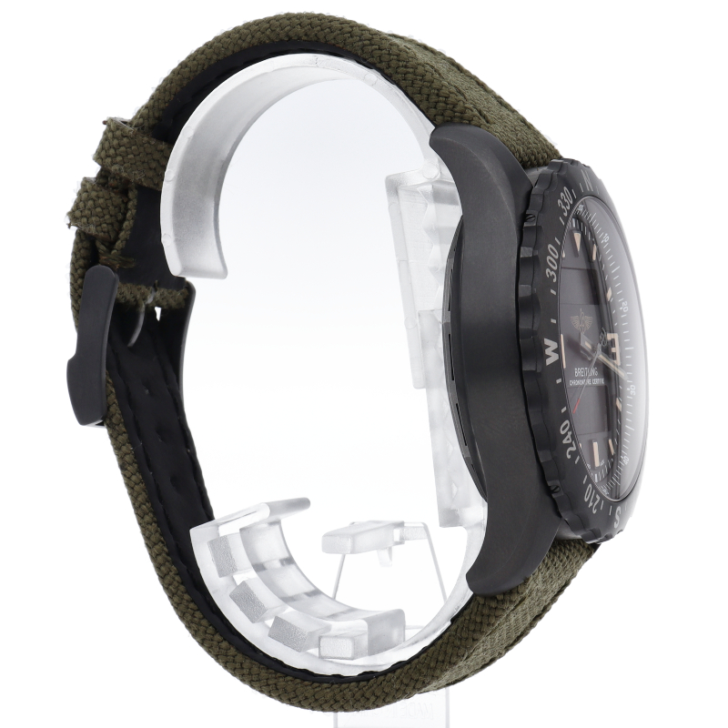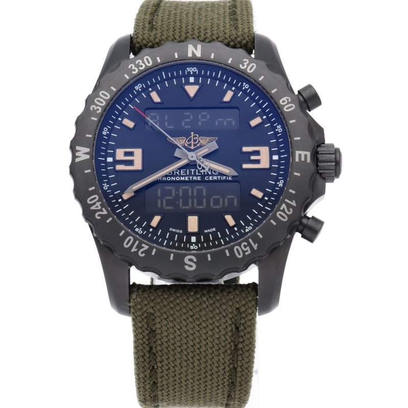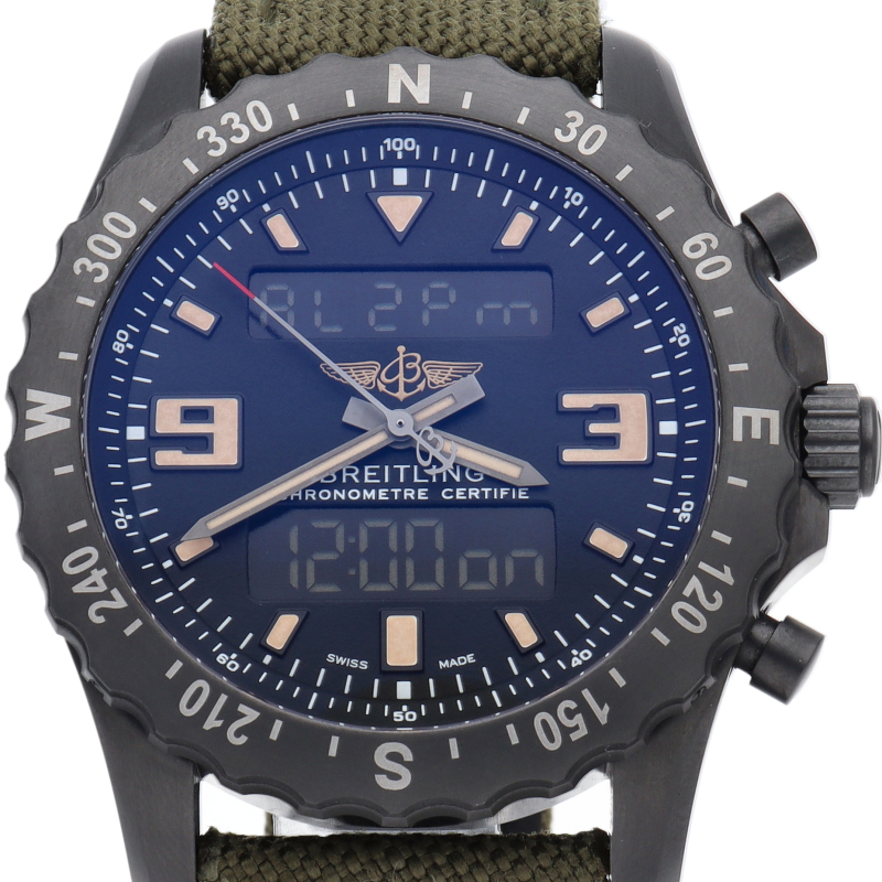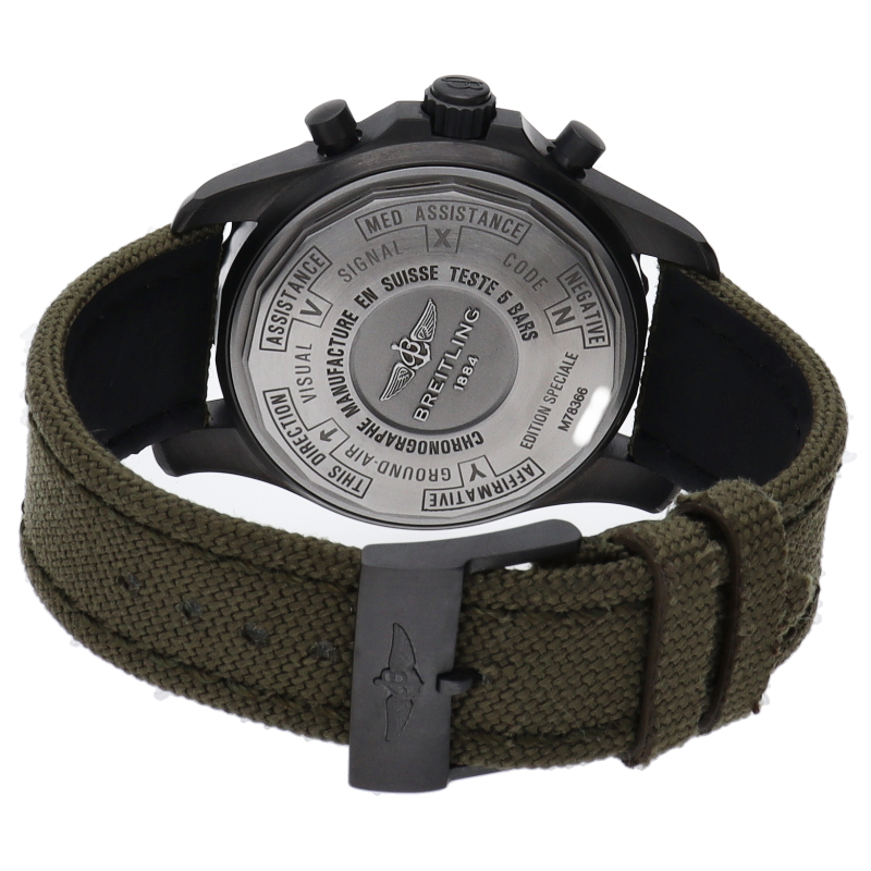 1/100秒クロノグラフ、2タイムゾーンUTC、カウントダウンタイマー、アラーム、永久カレンダー機能を備えた多機能モデル。ケースバックはジェットエンジンをモチーフにしたタービン形状で、アラームをはじめとする電子音を共振させ音量を増大させる構造です。ブライトリング78 スーパークオーツ搭載。