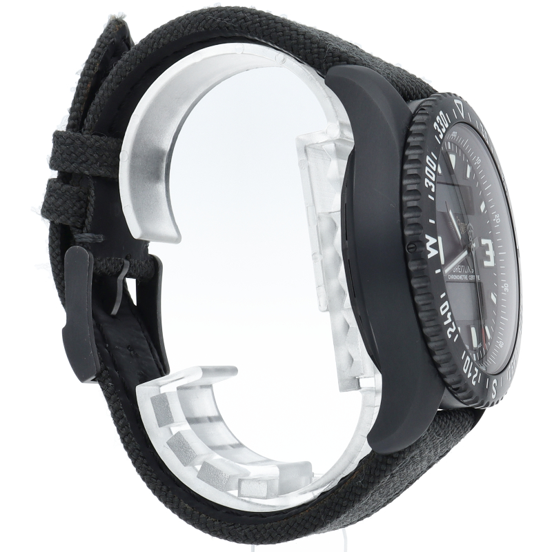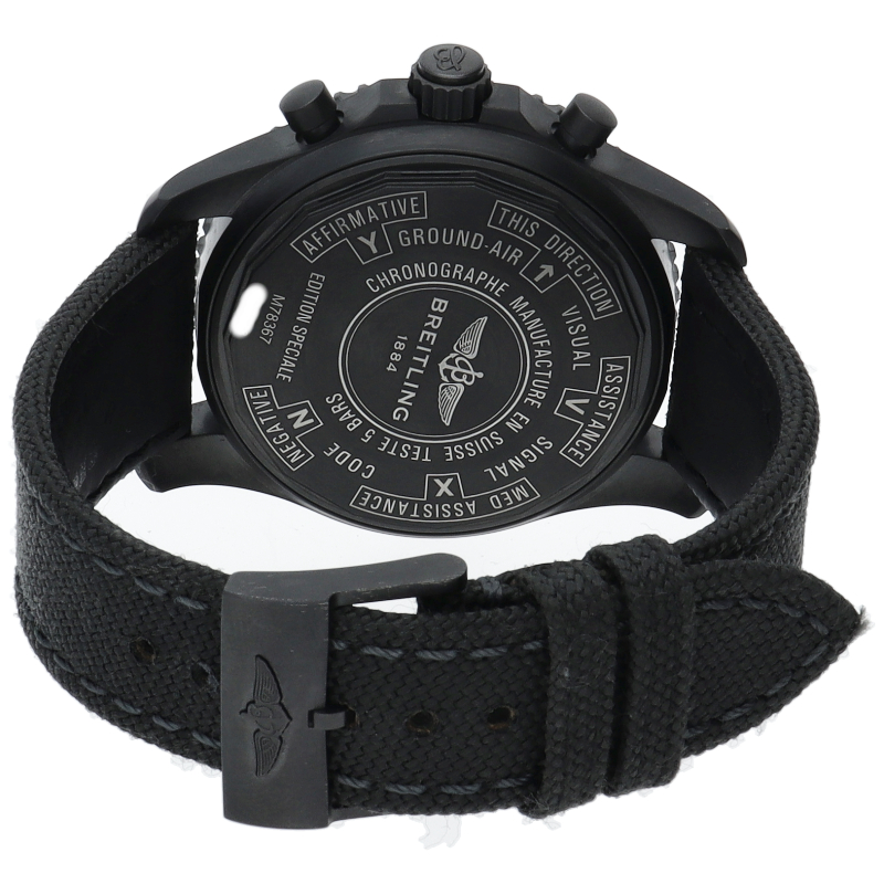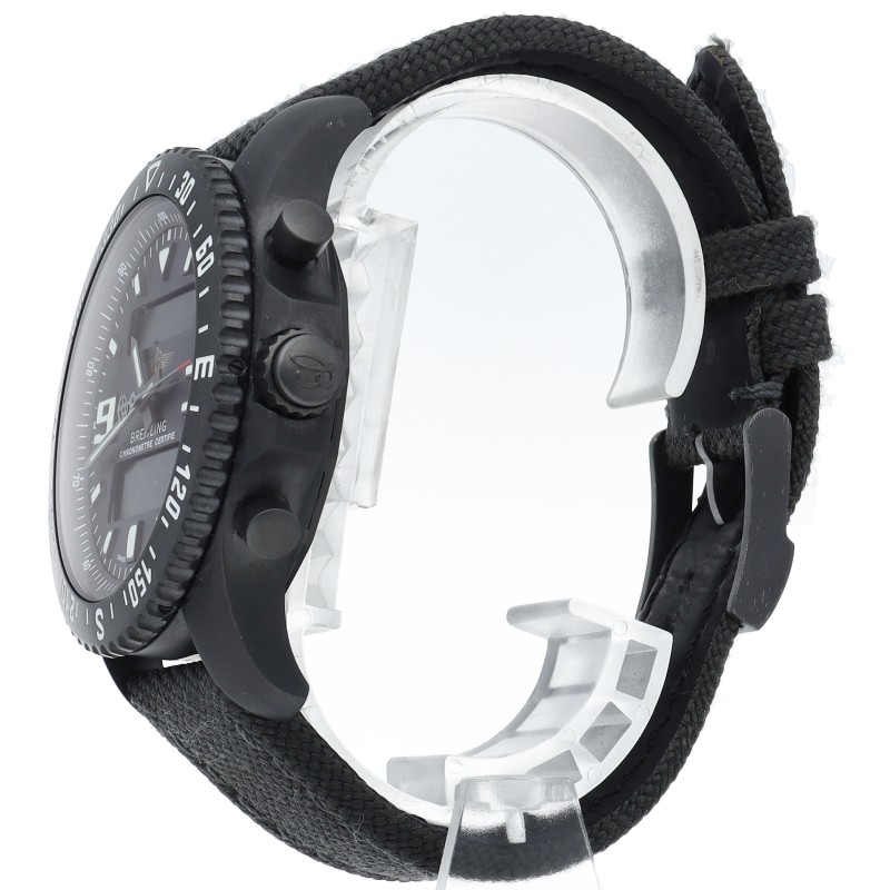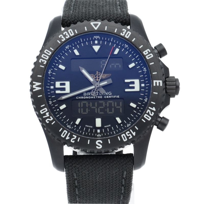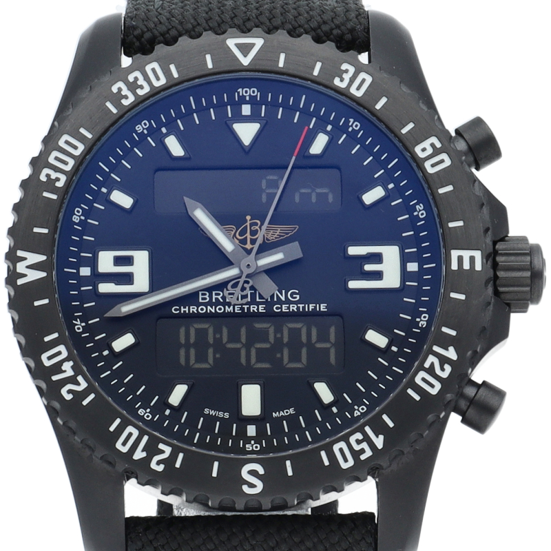 ブライトリングが誇る多機能クォーツ・クロノグラフ、クロノスペースのミリタリーバージョン。リューズ1本で、クロノグラフ、カウントダウンタイマー、アラームなどの機能を簡単に操作することができます。特殊炭素コーティングを施したブラックスチール製のケースと、強靭なミリタリー・タイプの合成繊維のストラップを装備しています。M78367/M78367101B1W1。