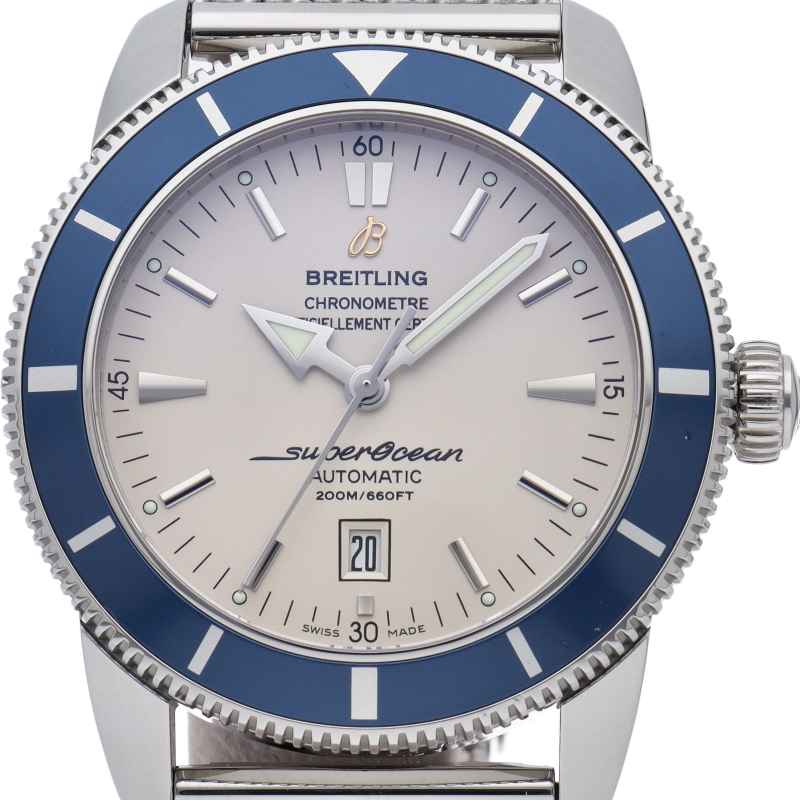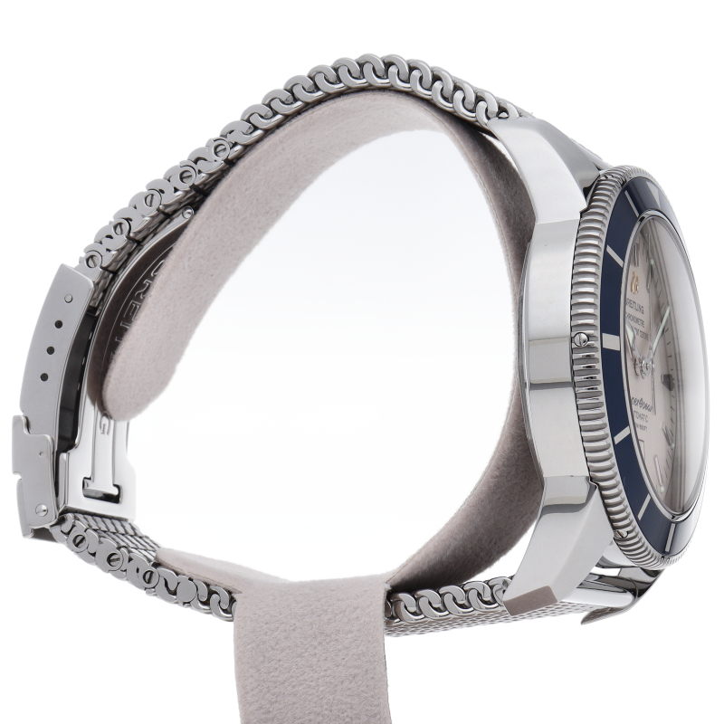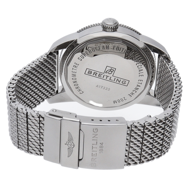 ブライトリングを代表するダイバーズ・コレクション「スーパーオーシャン」。こちらは1957年に発表された初代スーパーオーシャンへのオマージュとして創作されたモデルです。当時のブライトリングロゴや独特の時針、メッシュブレスレットなどオールドモデルの雰囲気が楽しめるモデルです。ムーブメントにはブライトリング17自動巻クロノメーターを搭載。A17320/A170G02OAC。