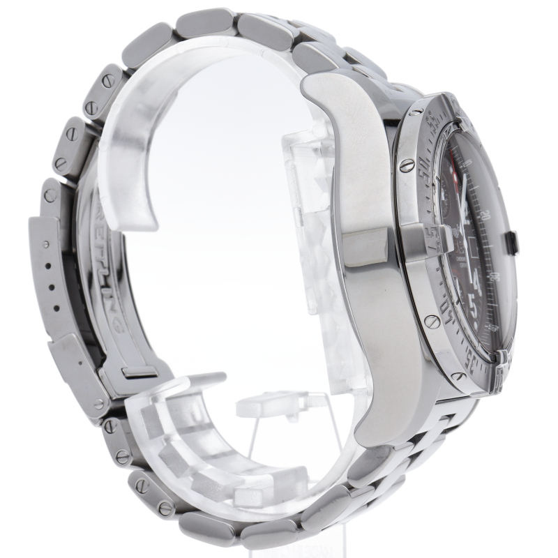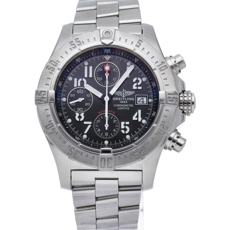 タフなクロノグラフを追求した「アベンジャー・スカイランド」。全てに強度と機能性を追及したモデルです。モダンなステンシル書体を採用したアラビアインデックスも特徴です。A13380/A338B61PRS。