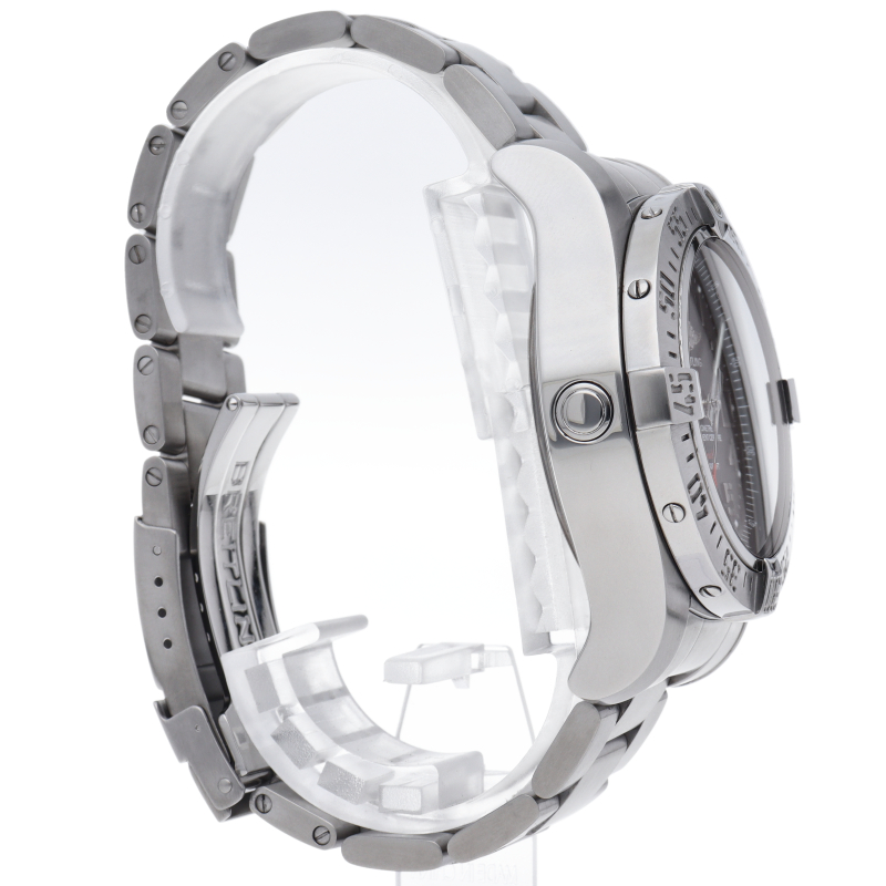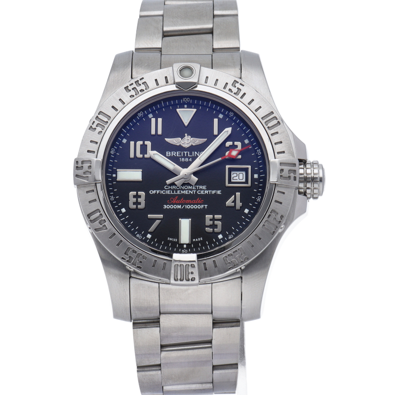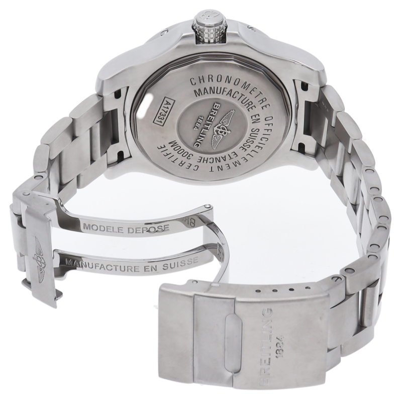 ヘリウムガス放出バルブを備えた3000m防水のプロダイバー仕様です。迫力ある大型45mmケースが特徴的。逆回転防止ベゼル、ねじ込みロック式のリューズなど、ダイバーが必要な機能をすべて備えた一本です。 自動巻きキャリバーブライトリング17を搭載しています。A17331/A077B31PSS。