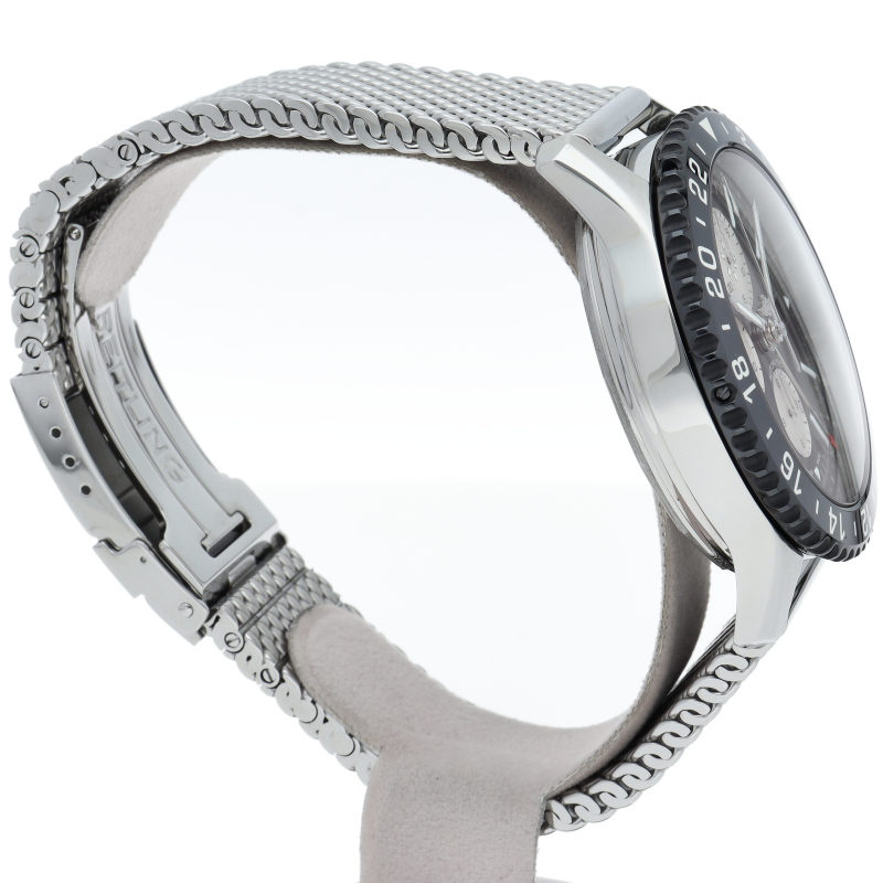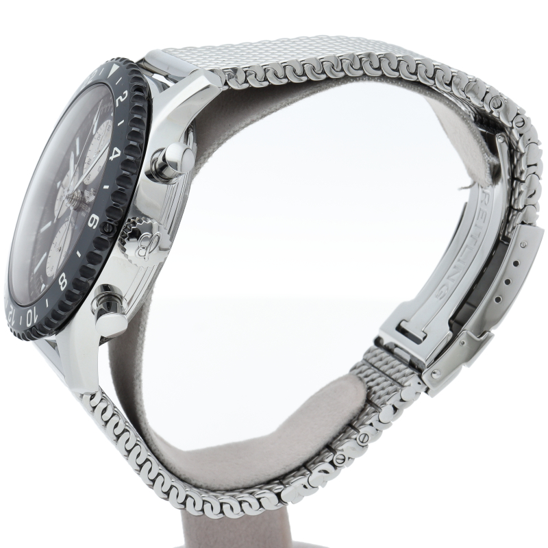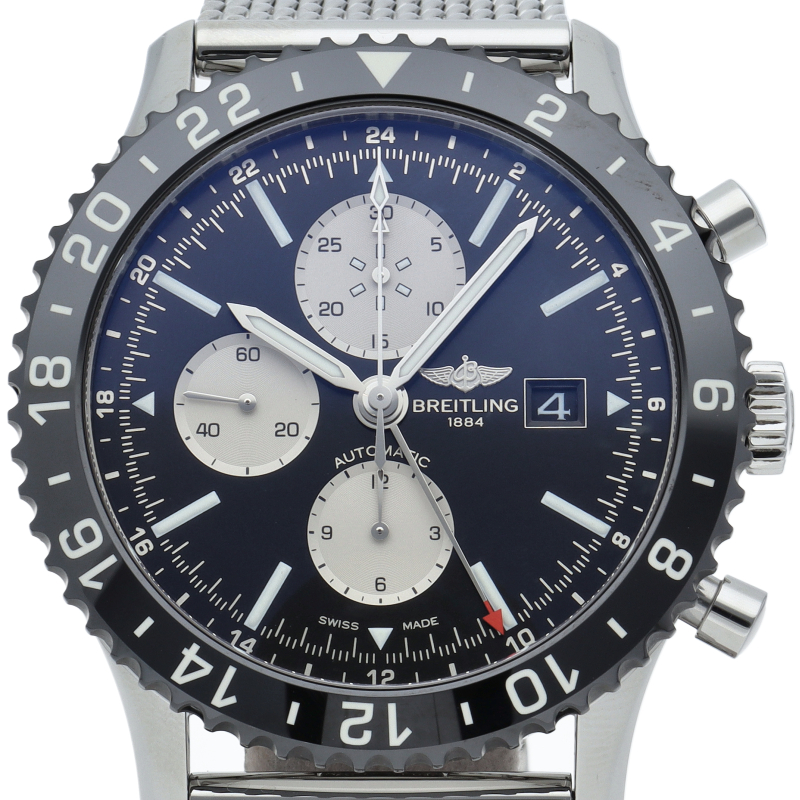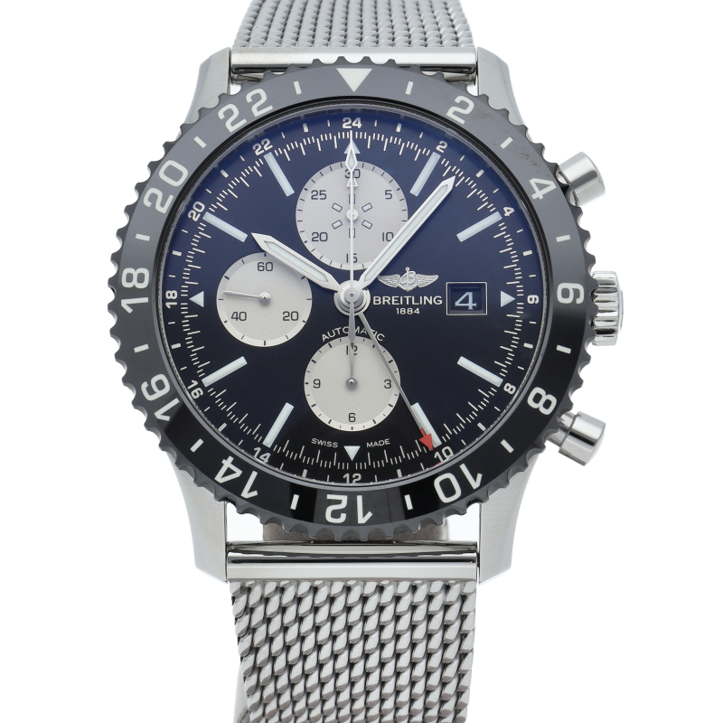 ブライトリングの1960年代の名作「アビエーション」を新しいスタイリングで復刻したモデルです。長距離フライトに対応した24時間表示の第2タイムゾーン表示を備え、回転ベゼルはブライトリング初のファインセラミック製となっています。Y24310/Y241B10OCA。