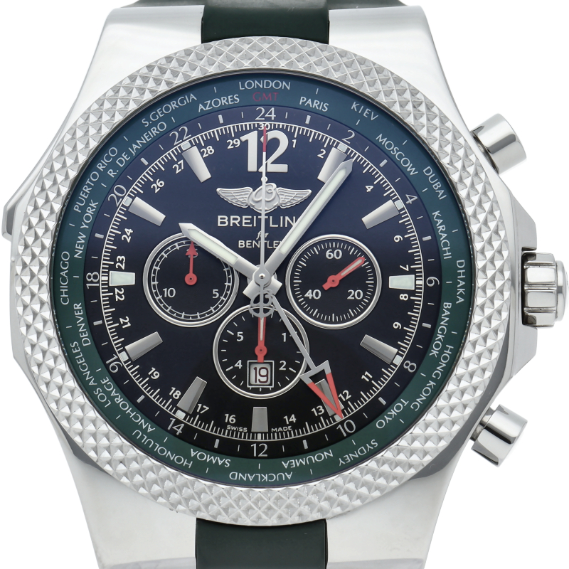49MMの大型ケースが圧倒的な存在感を放つベントレーGMT。ラックピニオン式の回転ベゼルを操作することにより、インナーベゼルのシティコードディスクが回転し、ワールドタイムにもなるGMT機能を備えます。A47362/A47362S4/B919。