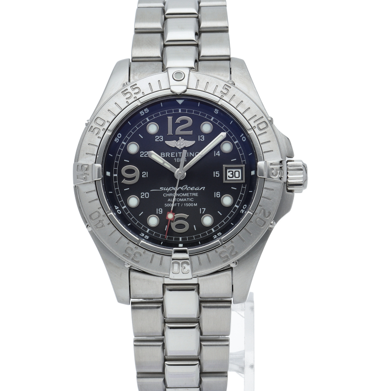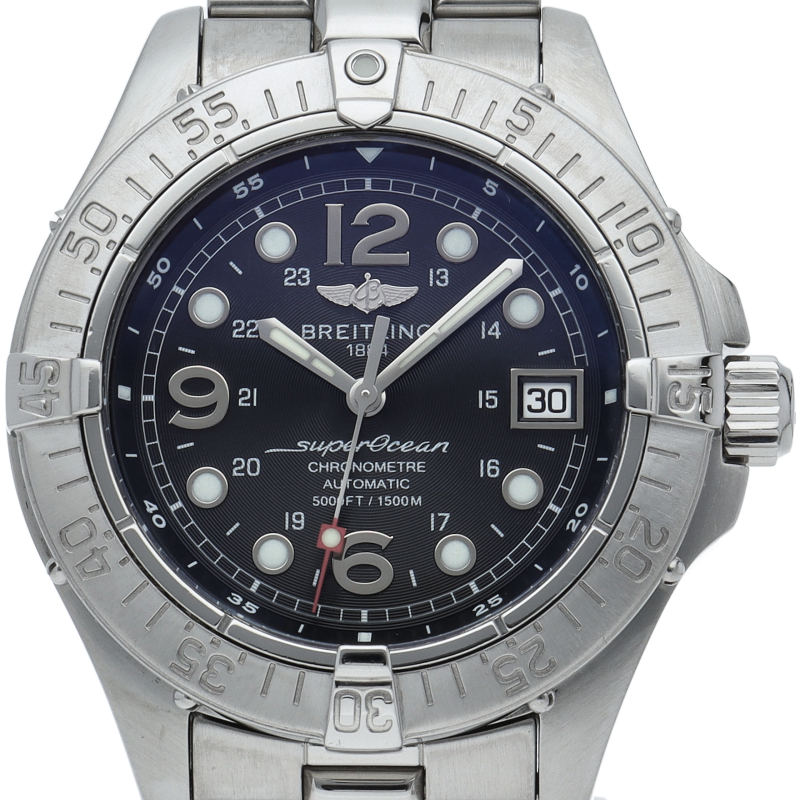 特殊部隊の為に開発されたスーパーオーシャン。ケース内の圧力差が約3気圧を超えると、ケース内に蓄積したヘリウムガスを自動的に放出し、時計が破裂するのを防ぐという画期的な機構を搭載しています。視認性もよく、1500メートルという圧倒的な防水性能は、他のモデルを圧倒します。A17360。