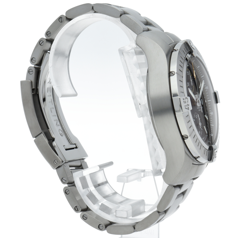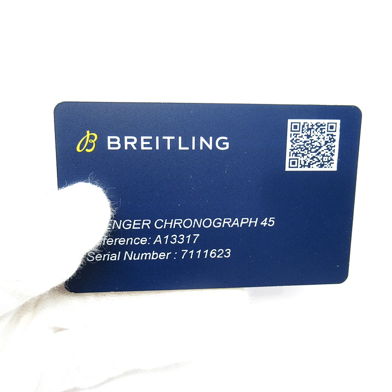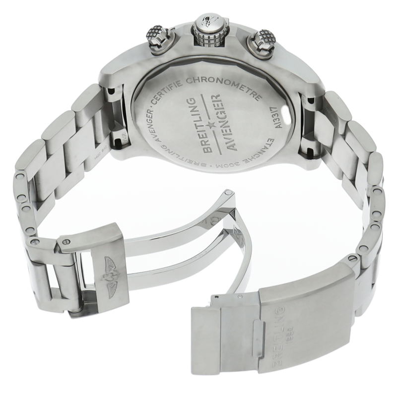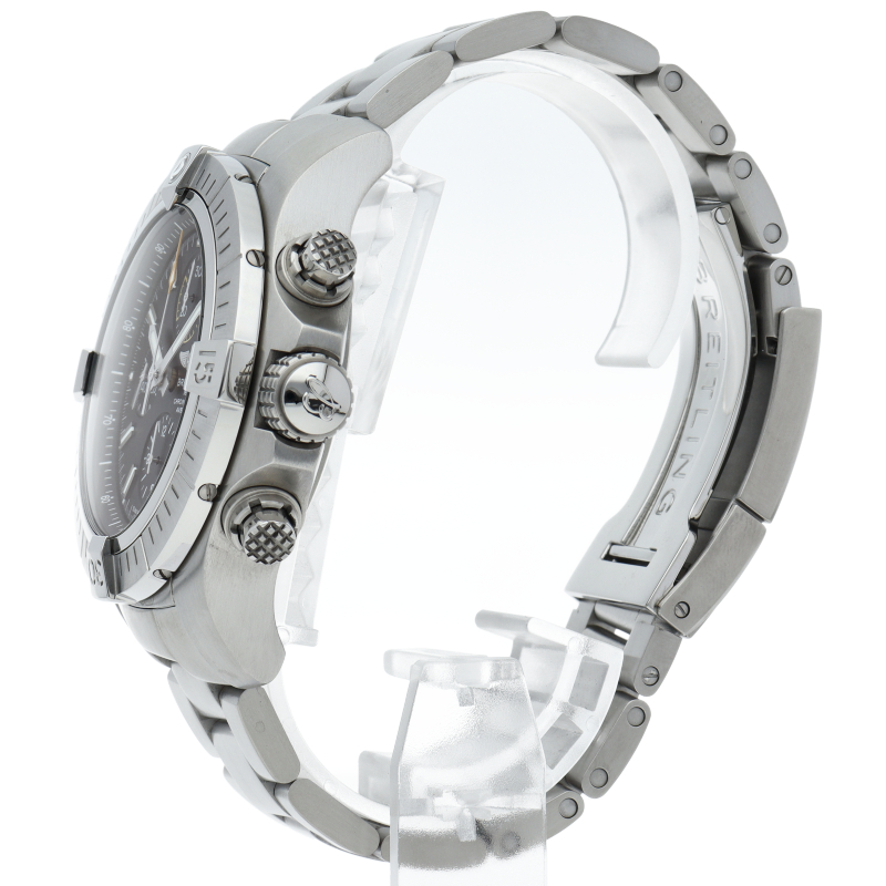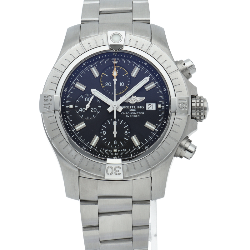 大胆な外観に頑強かつ優れた耐衝撃性を備えたアベンジャー クロノグラフ 45のステンレススチール製ケースは逆回転防止機能付きラチェット式ベゼルを装備、ダイヤルはブラックまたはブルーをご用意しました。ムーブメントは自動巻きのブライトリング キャリバー13を搭載。A13317/A13317101B1A1。