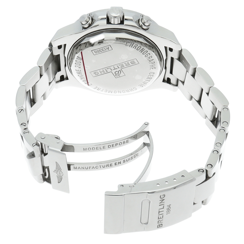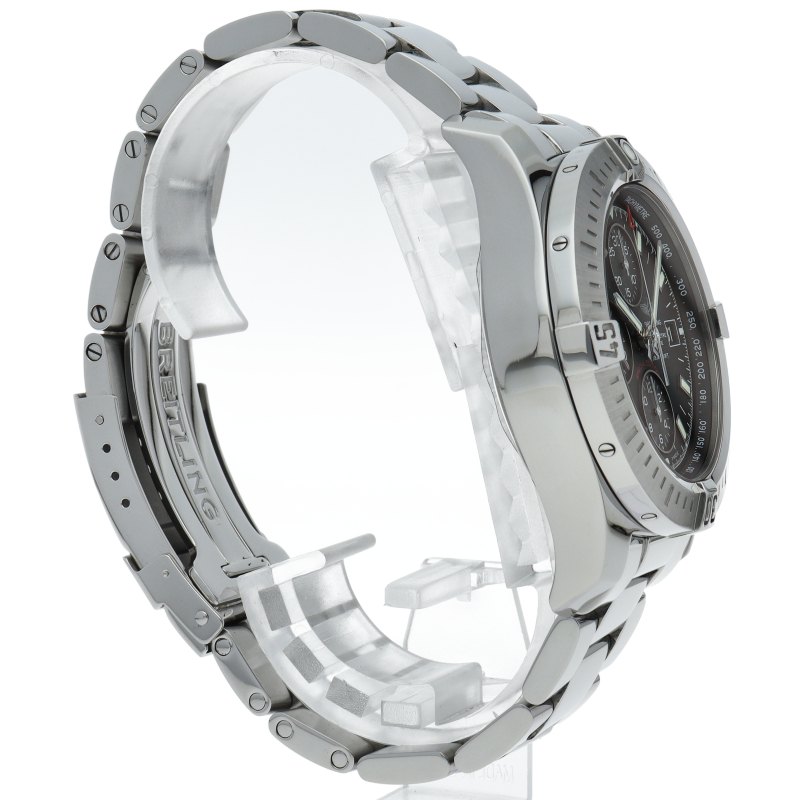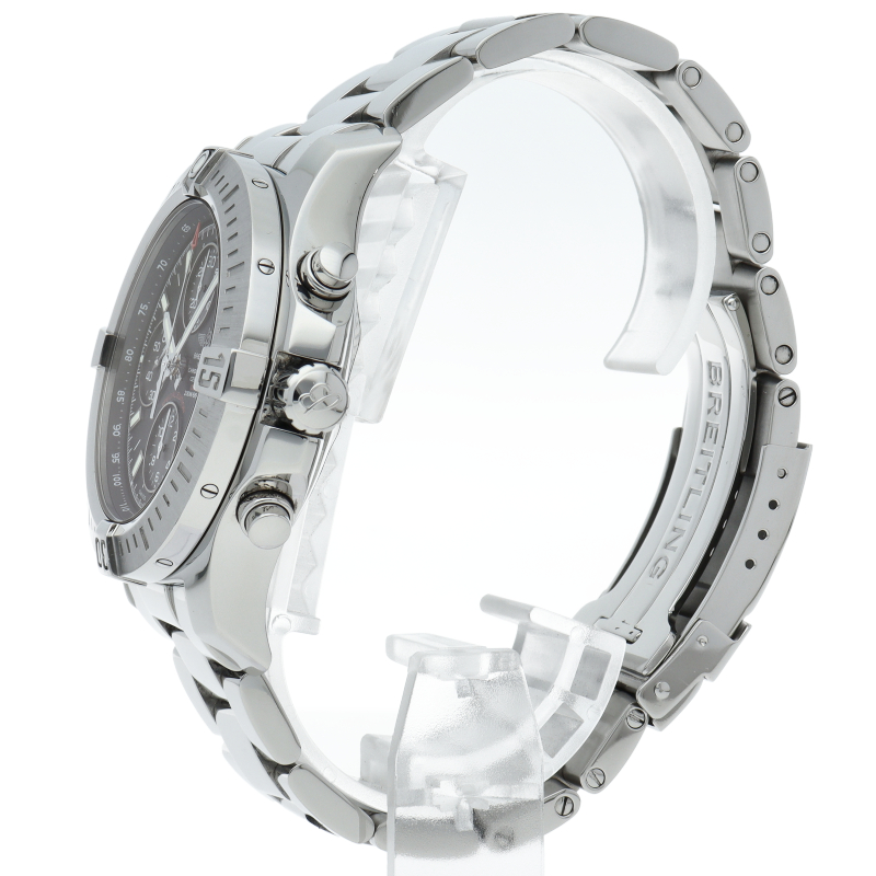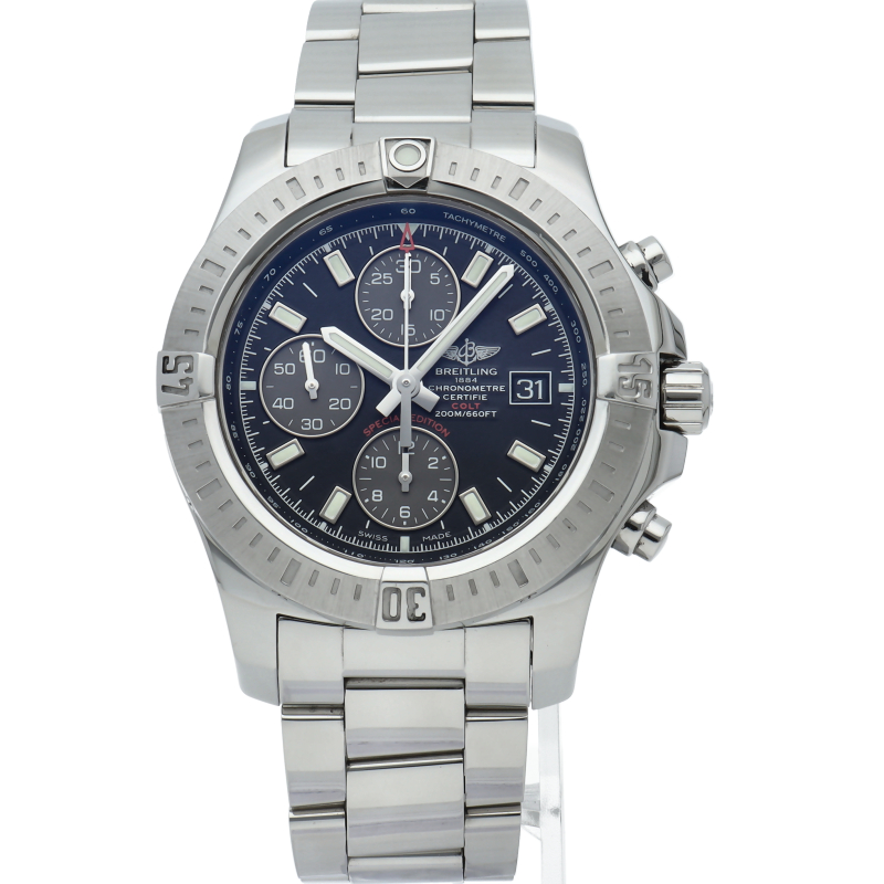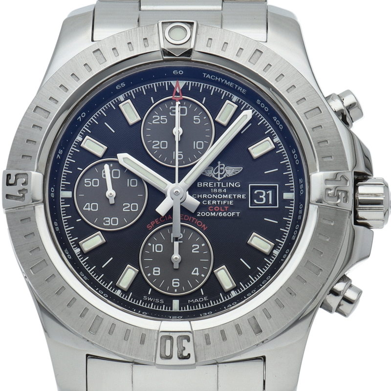 クロノグラフ機構を搭載した人気モデル「コルト クロノグラフ」。幅の広いサテン仕上げのベゼルには、ブライトリングファンにおなじみのライダータブが装備されます。A13388/A181B72PCS。