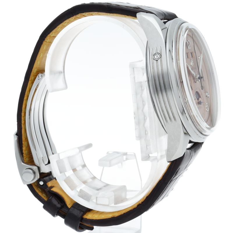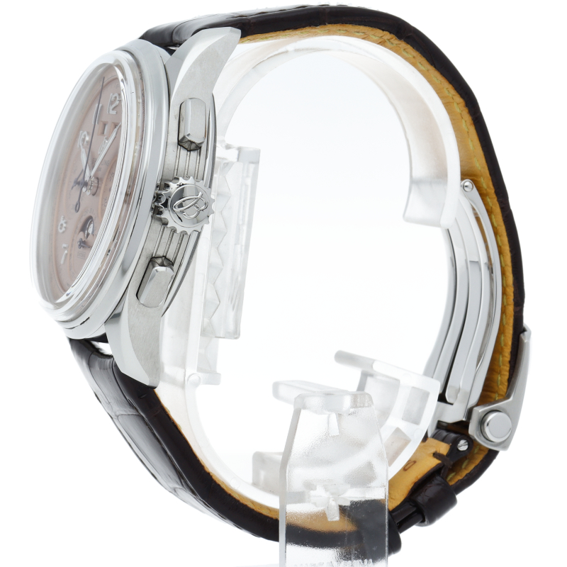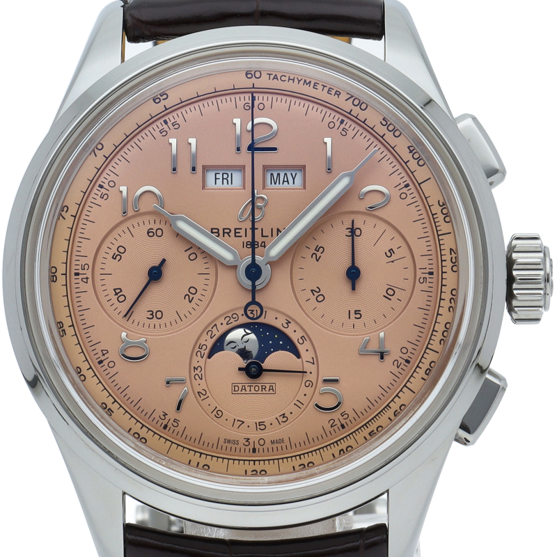 レオン、ガストン、ウィリー・ブライトリングという3世代の発明家へのオマージュが込められた「プルミエ ダトラ」。「Cal.ブライトリングB25」は、トリプルカレンダー、クロノグラフ、ムーンフェイズを備えながら、クロノメーターを取得した高精度ムーブメントとなっています。複雑機構を備えたサーモンピンクの「カッパー」文字盤のクラシカルな雰囲気は、パテックフィリップのグランドコンプリケーションウォッチを彷彿とさせる