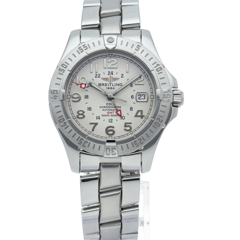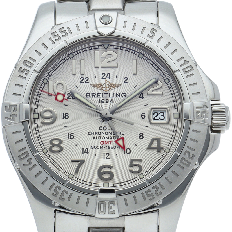 500mの防水性能を備えたブライトリングの人気モデルのエアロマリン コルトにGMTが搭載されたモデルです。高い性能や回転ベゼルなど充実の高スペックを搭載しながらも、大変リーズナブルな価格でエントリーウォッチとして人気の高いモデルです。