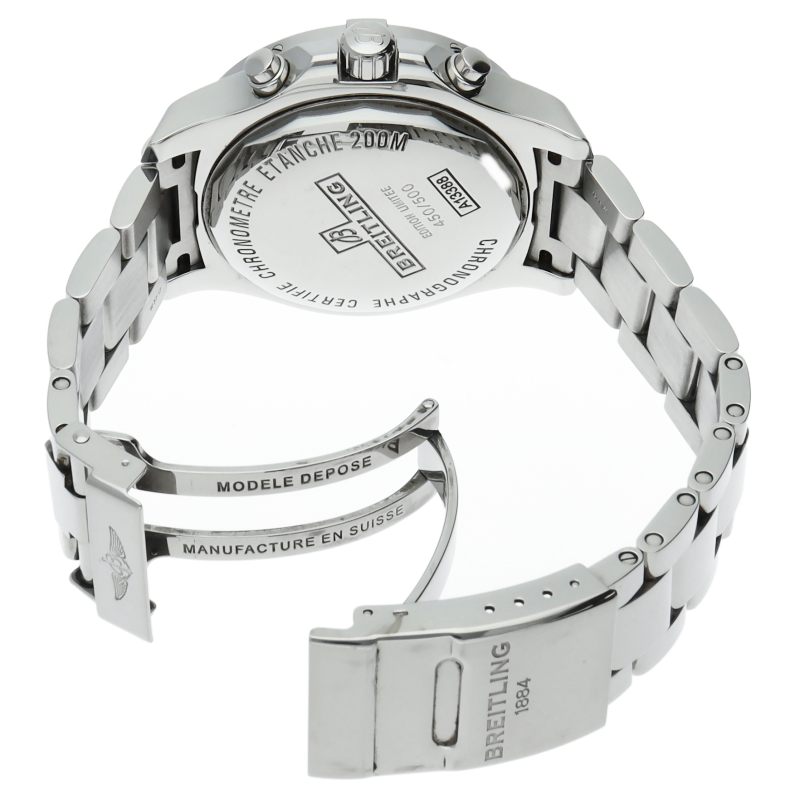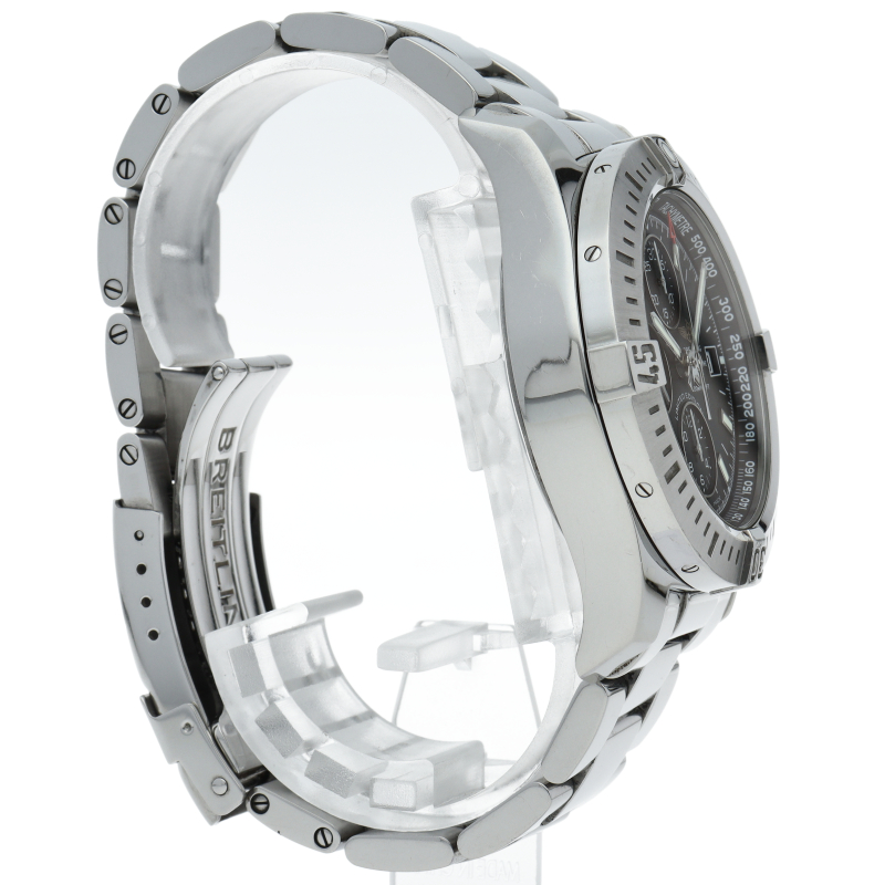 クロノグラフ機構を搭載した人気モデル「コルト クロノグラフ」。幅の広いサテン仕上げのベゼルには、ブライトリングファンにおなじみのライダータブが装備されます。こちらは日本限定500本で発売されたインダイヤルもブラックの文字盤です。A13388/A181B68PCS。