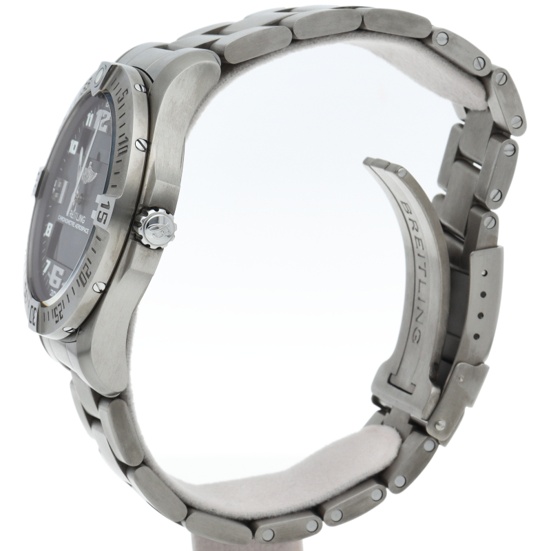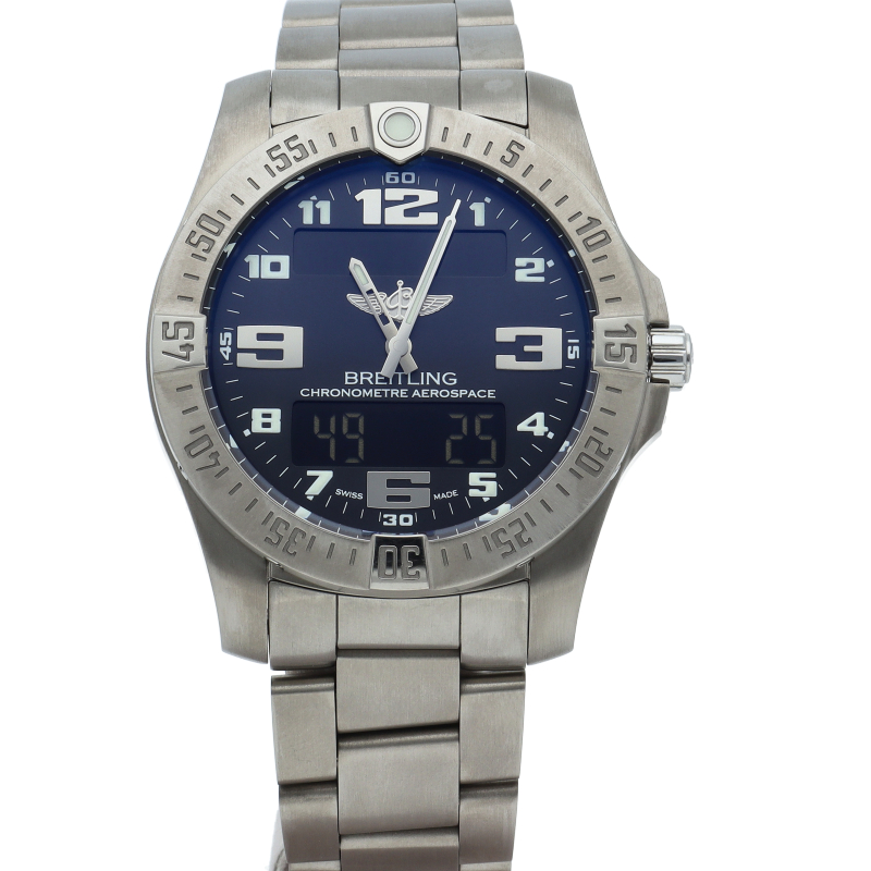 エアロスペース エヴォは、力強く、ダイナミックでテクニカルなスタイルを保持しつつ、技術的な進化を遂げてきました。公認クロノメーター スーパークォーツキャリバーを搭載し、1/100秒から計測できるクロノグラフ、カウントダウンタイマー、第2タイムゾーン表示、アラーム、時報信号(ミニッツリピーター)、カレンダーといった機能を、リューズ操作だけで活用できるユーザーフレンドリーな機構を備えています。E79363/E79363101