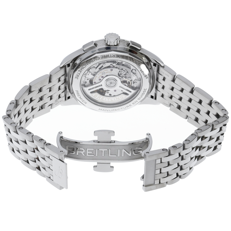 完全自社開発&自社製造クロノグラフムーブメント、「ブライトリング 01」を搭載し、シースルーバック仕様を採用したモデルです。AB0145/AB0145211G1A1