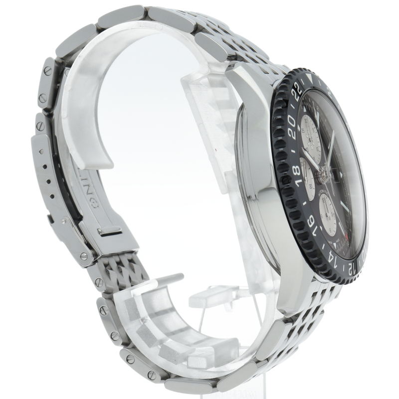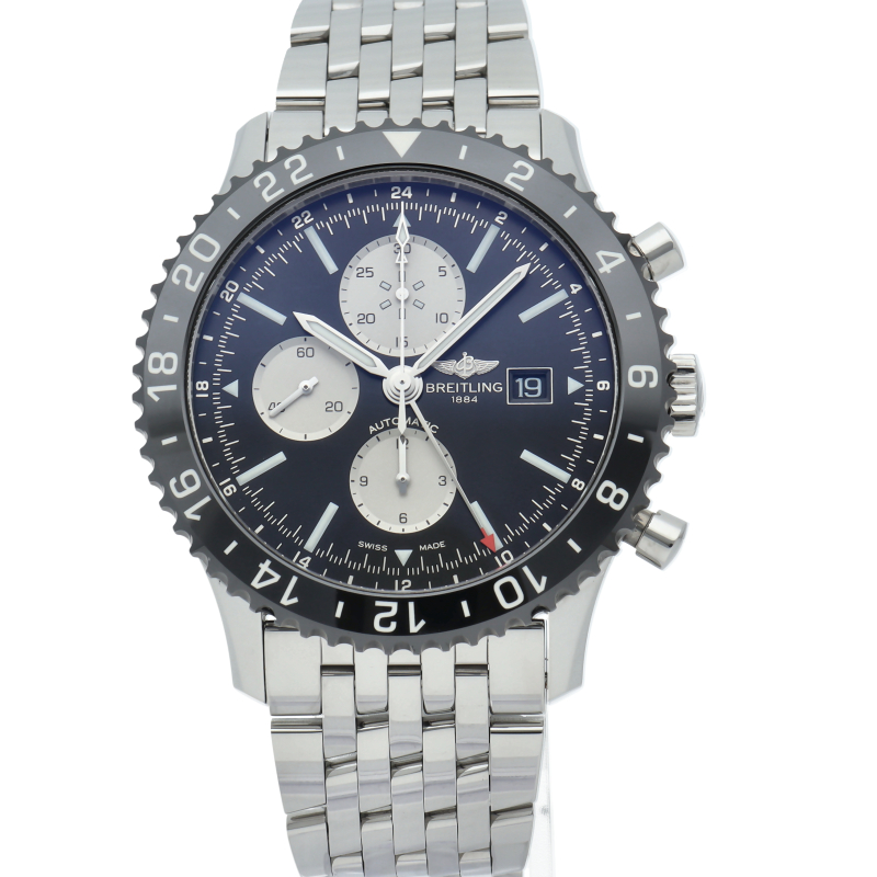 ブライトリングの1960年代の名作「アビエーション」を新しいスタイリングで復刻したモデルです。長距離フライトに対応した24時間表示の第2タイムゾーン表示を備え、回転ベゼルはブライトリング初のファインセラミック製となっています。Y24310/Y2431012/BE10。