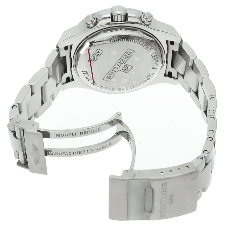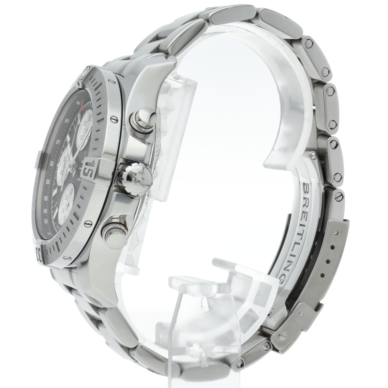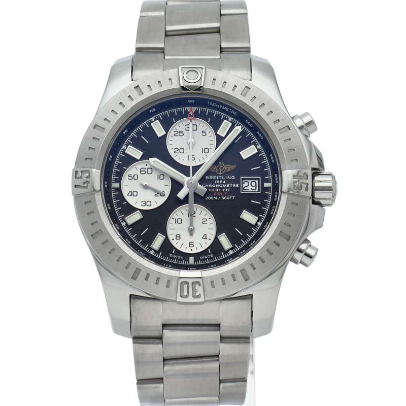 クロノグラフ機構を搭載した人気モデル「コルト クロノグラフ」。幅の広いサテン仕上げのベゼルには、ブライトリングファンにおなじみのライダータブが装備されます。A13388/A1338811/BD83。