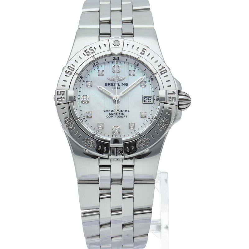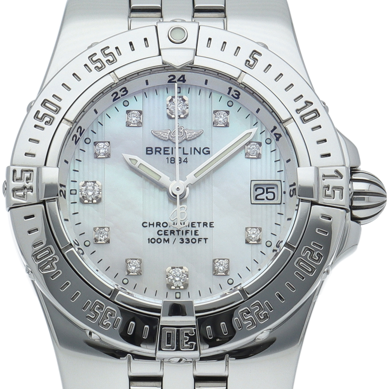 ブライトリングの「スターライナー」です。 スポーティで男性的なイメージのブライトリングですが、こちらのモデルはケース径30mmで女性のお手元にもフィットするサイズです。 視認性も良く、3時位置にデイト表示もあり実用的です。A71340/A710A02PA。