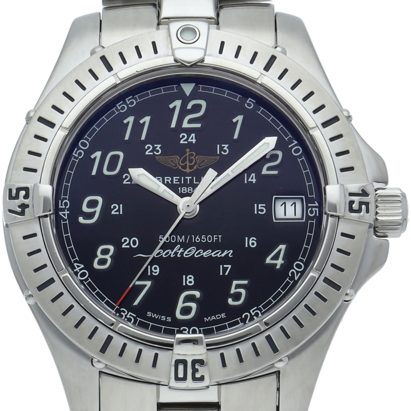 パイロットウォッチが有名なブライトリングですが、こちらは500m防水機能を備えたダイバーズシリーズ、コルトオーシャン。A64350/A655B13FA