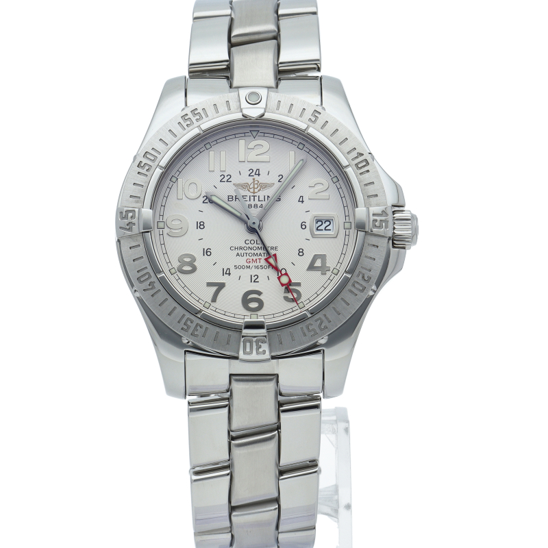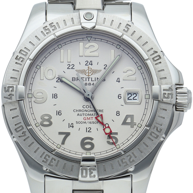 500mの防水性能を備えたブライトリングの人気モデルのエアロマリン コルトにGMTが搭載されたモデルです。高い性能や回転ベゼルなど充実の高スペックを搭載しながらも、大変リーズナブルな価格でエントリーウォッチとして人気の高いモデルです。