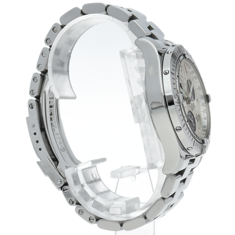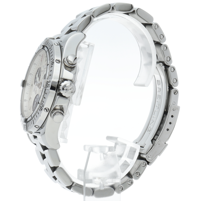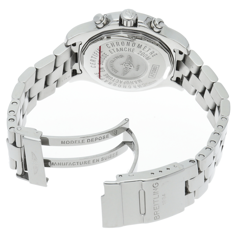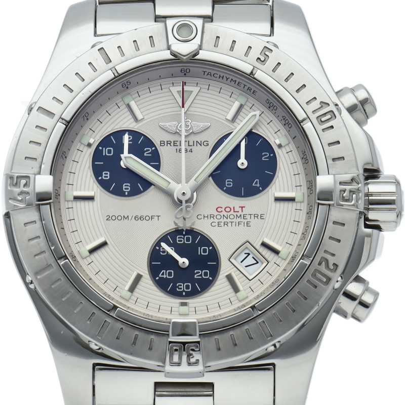 クロノグラフ機構を搭載した人気モデル「コルト クロノグラフ」。幅の広いサテン仕上げのベゼルには、ブライトリングファンにおなじみのライダータブが装備されます。A73380/A738G97PRS