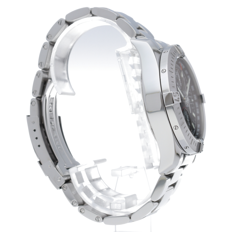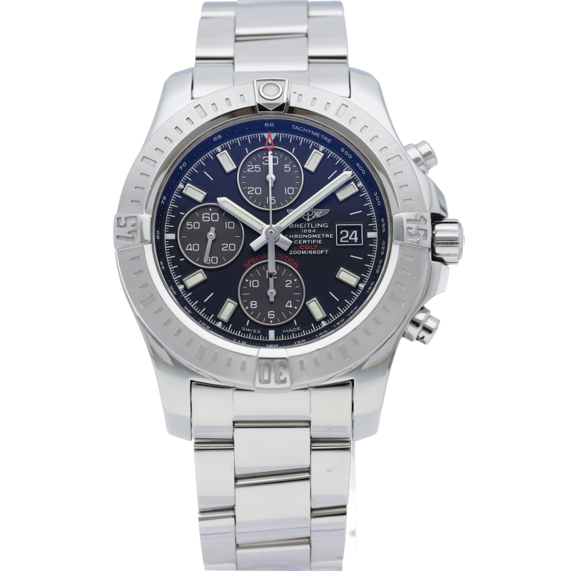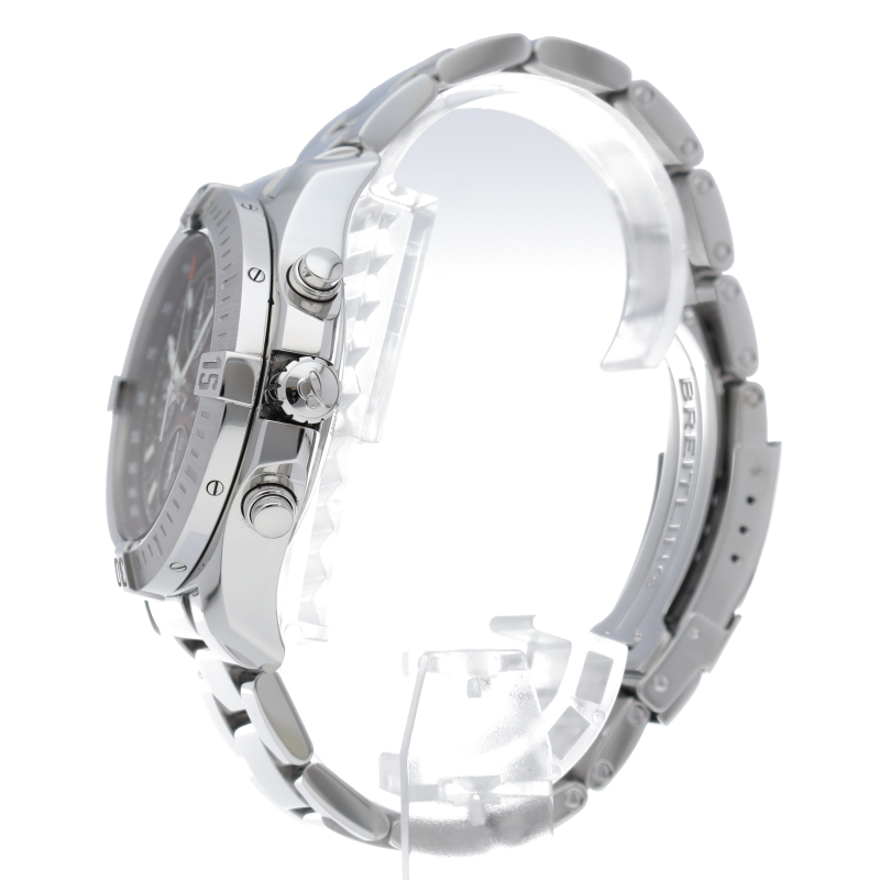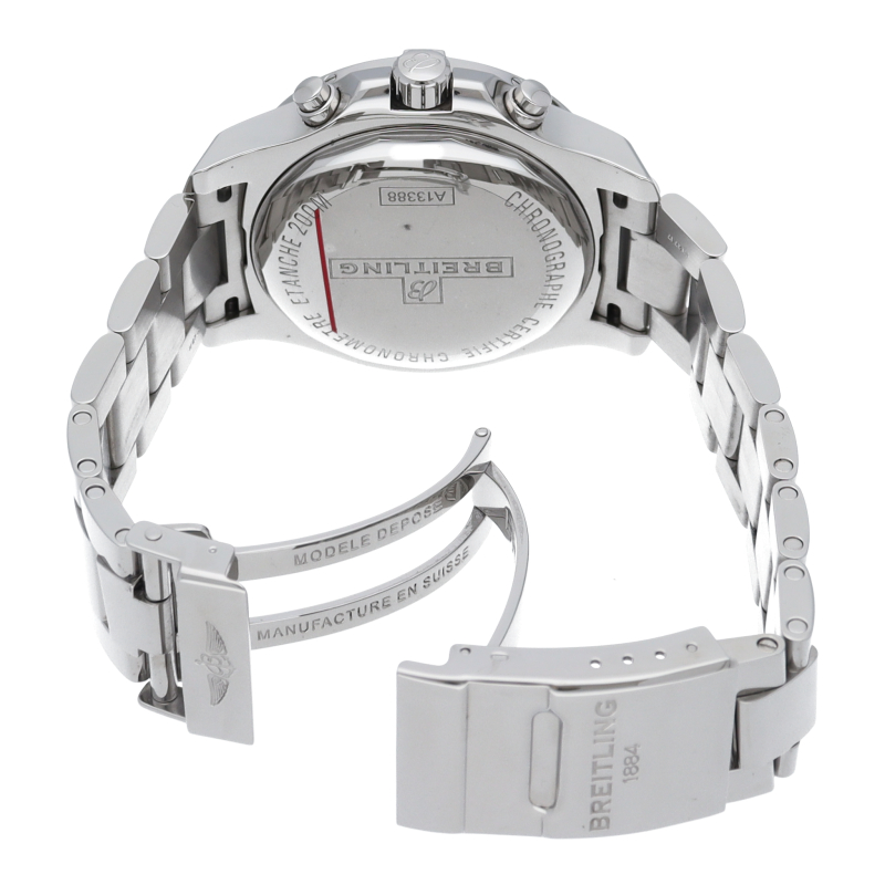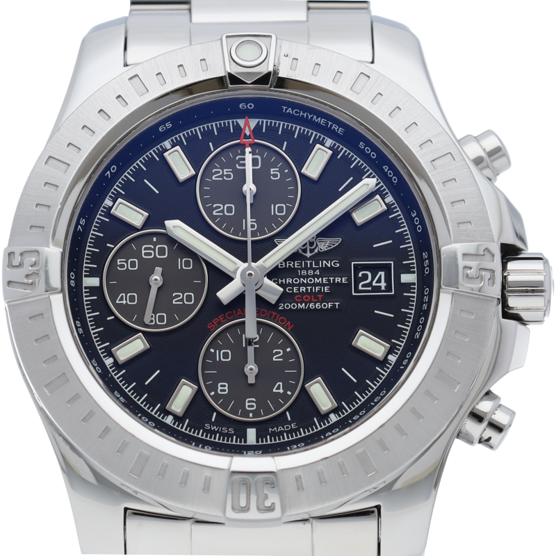 クロノグラフ機構を搭載した人気モデル「コルト クロノグラフ」。幅の広いサテン仕上げのベゼルには、ブライトリングファンにおなじみのライダータブが装備されます。A13388/A181B72PCS。