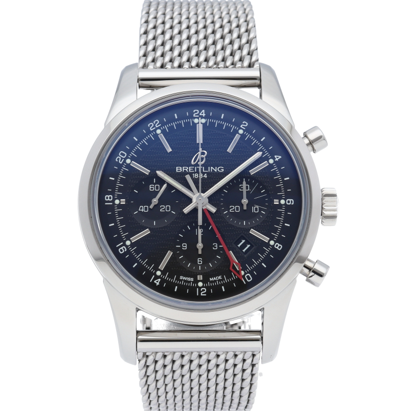 1950年~60年代に主流であった美しいクロノグラフをコンセプトに、現代の技術を惜しげもなく投入したのがトランスオーシャン・クロノグラフです。こちらのGMTモデルは世界2000本限定。真紅のGMT針が目立つクロノグラフモデルです。心臓部はブライトリングが自社開発した「ブライトリング04」を搭載。AB0451/AB045112BC67